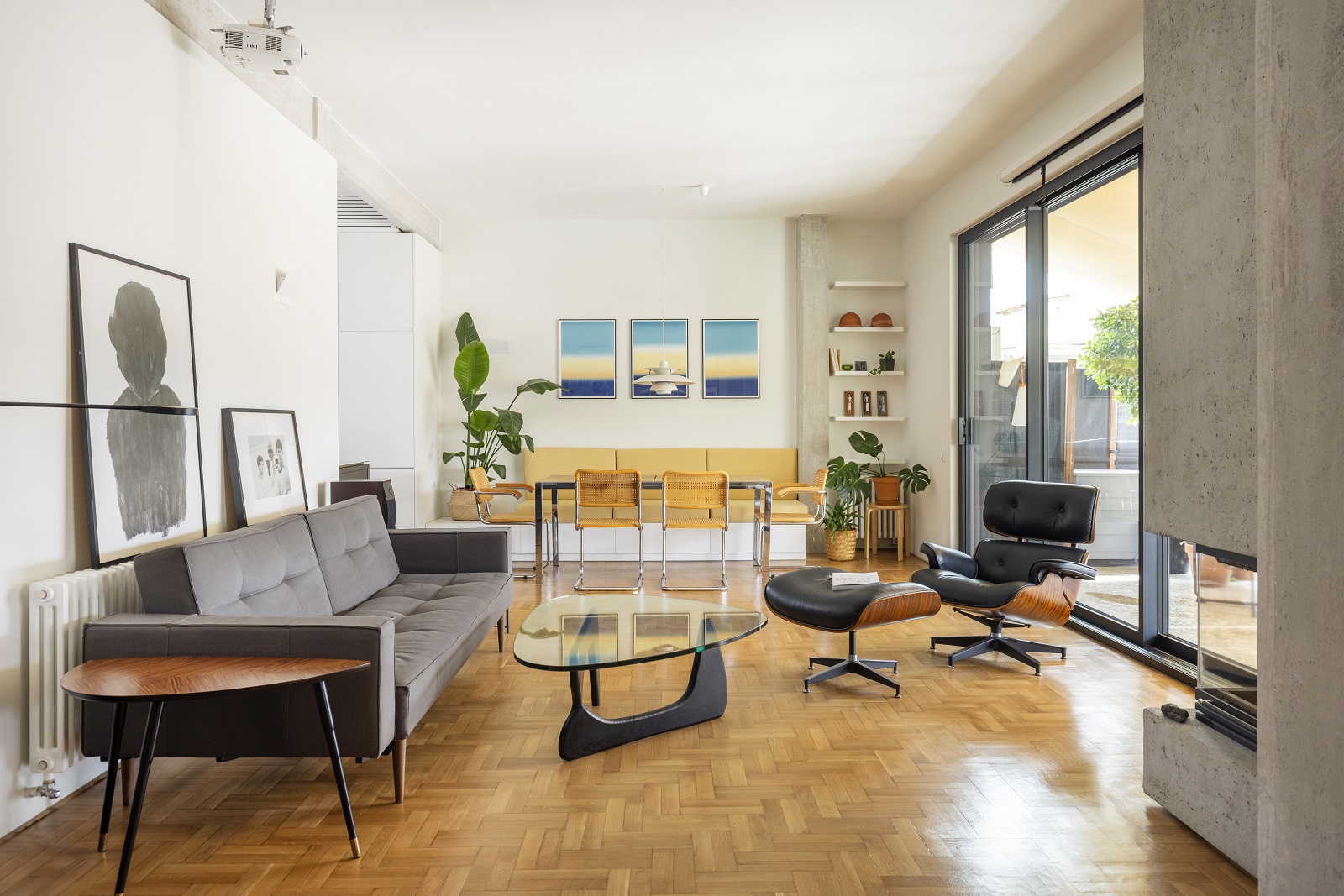 Considering the space has a loft, priority was given to the layout and functionality as well as the accessibility of people with reduced mobility (i.e. barrier-free). For this reason, the wheelchair access to the store is assured with a ramp, while on the right the table seats dominate the main space. The service areas, the kitchen, bar, WC and food storage are located in the back of the ground floor and attic.