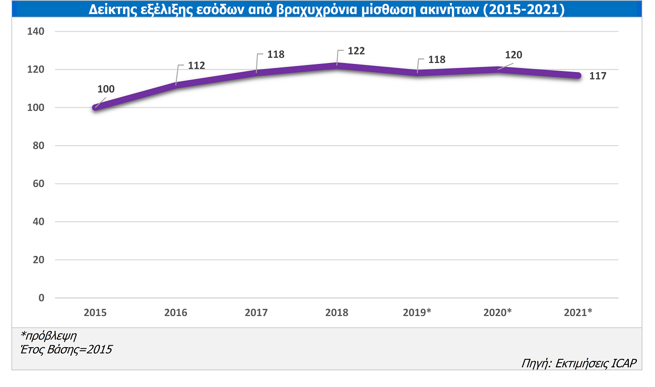 Σύμφωνα με πρόβλεψη της ICAP, βασισμένη σε κατάλληλο οικονομετρικό υπόδειγμα, τα έσοδα από βραχυχρόνια μίσθωση θα παρουσιάσουν μικρές ετήσιες μεταβολές την τριετία 2019-2021.