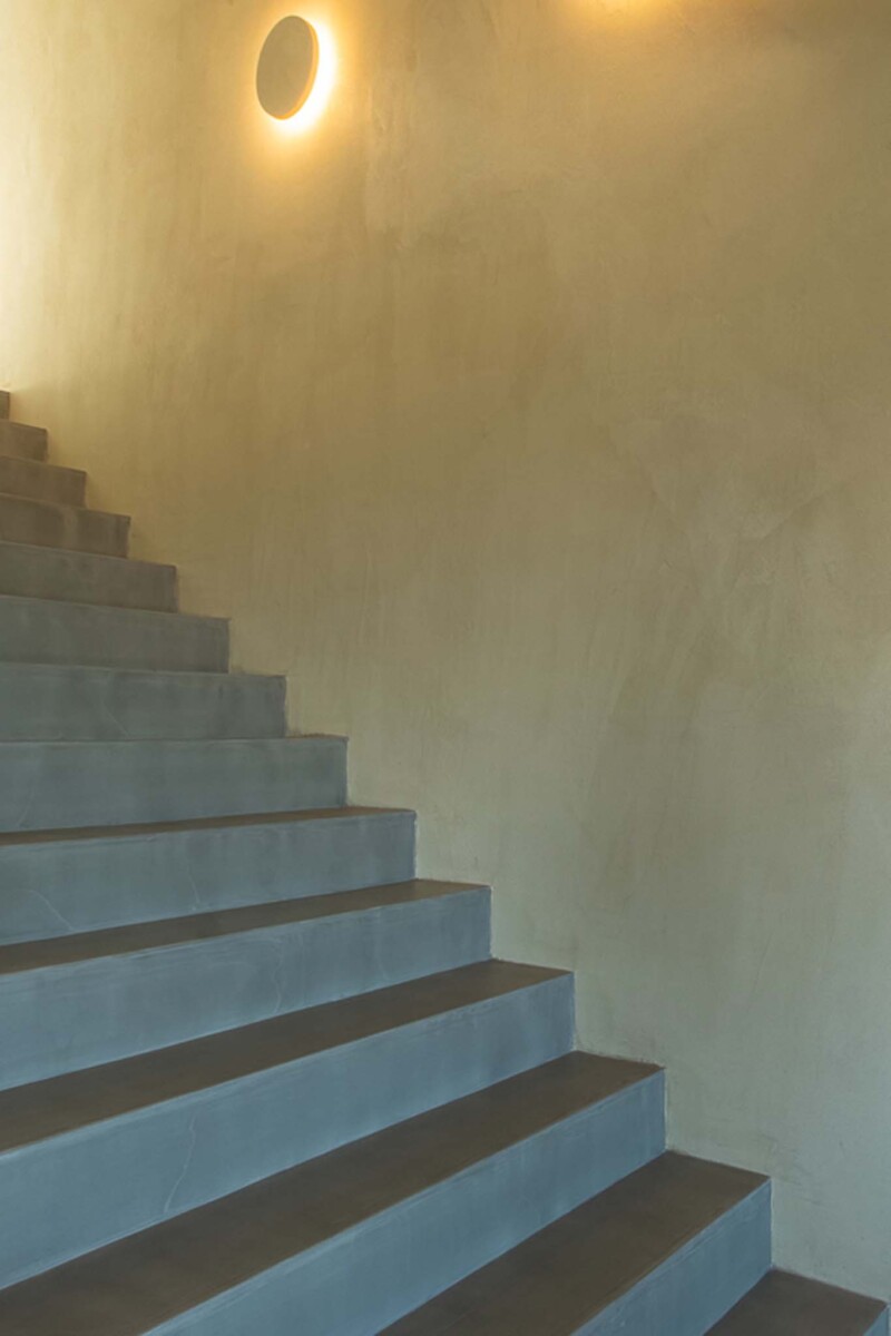 The house is divided in two levels, with the first floor receding from the ground floor, following the topography of the structured terraces. Approaching the building from afar, the visitor passes between two olive trees, a trademark of the house and faces an introverted view.