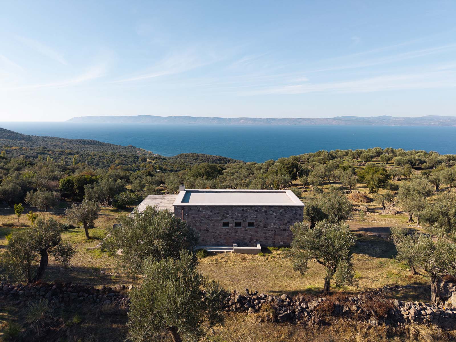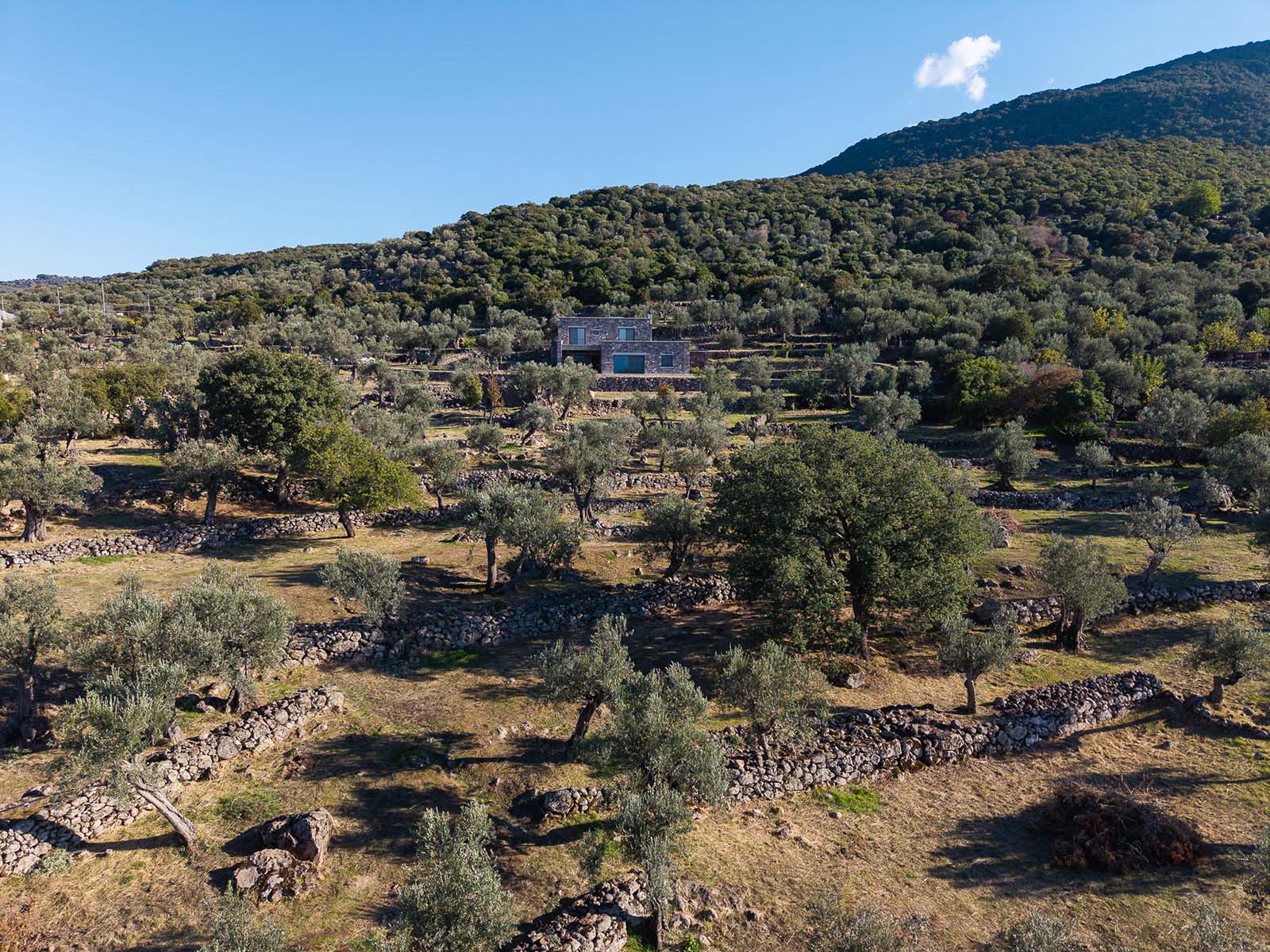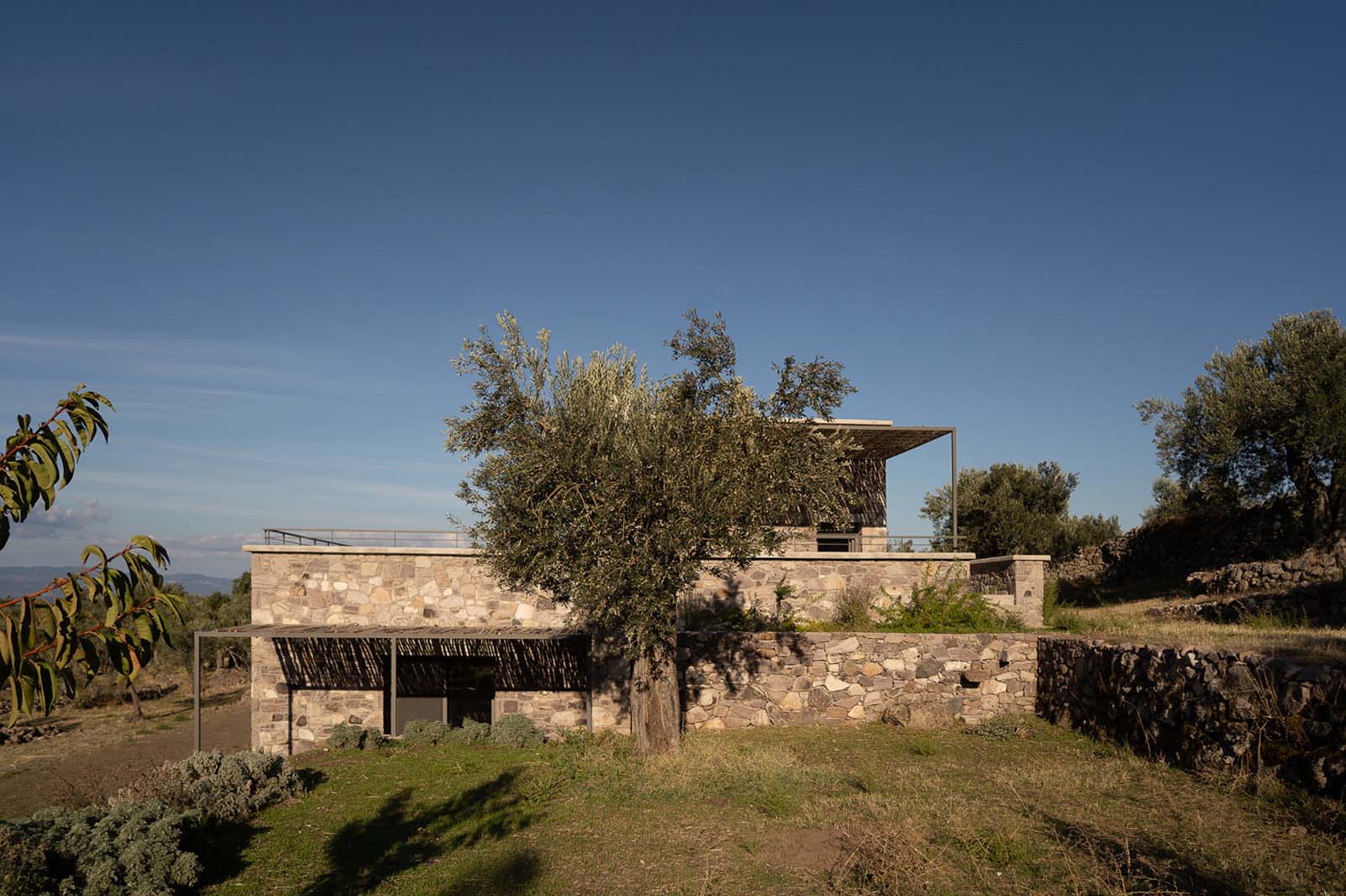 English description: On the island of Lesvos, close to the settlement of Sykamia, in an olive grove formed entirely by stone terraces of great aesthetic and historical value, architect Alexandra Kallitsa designed the Rachta Residence.