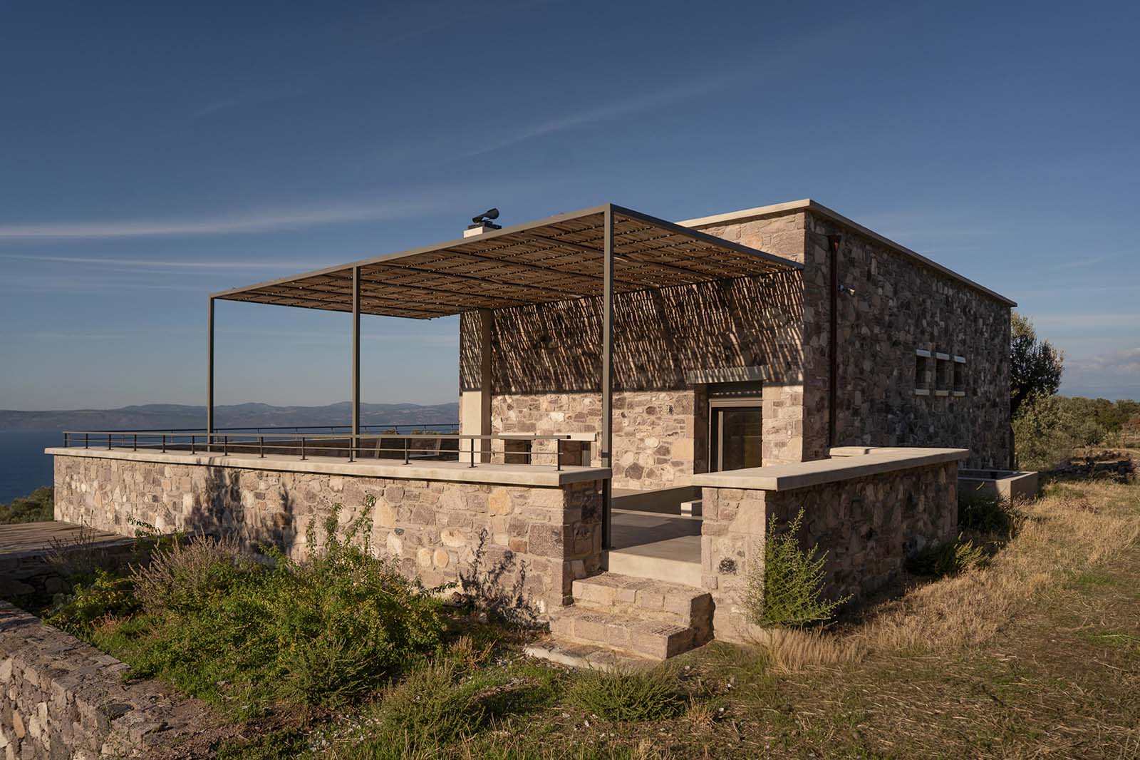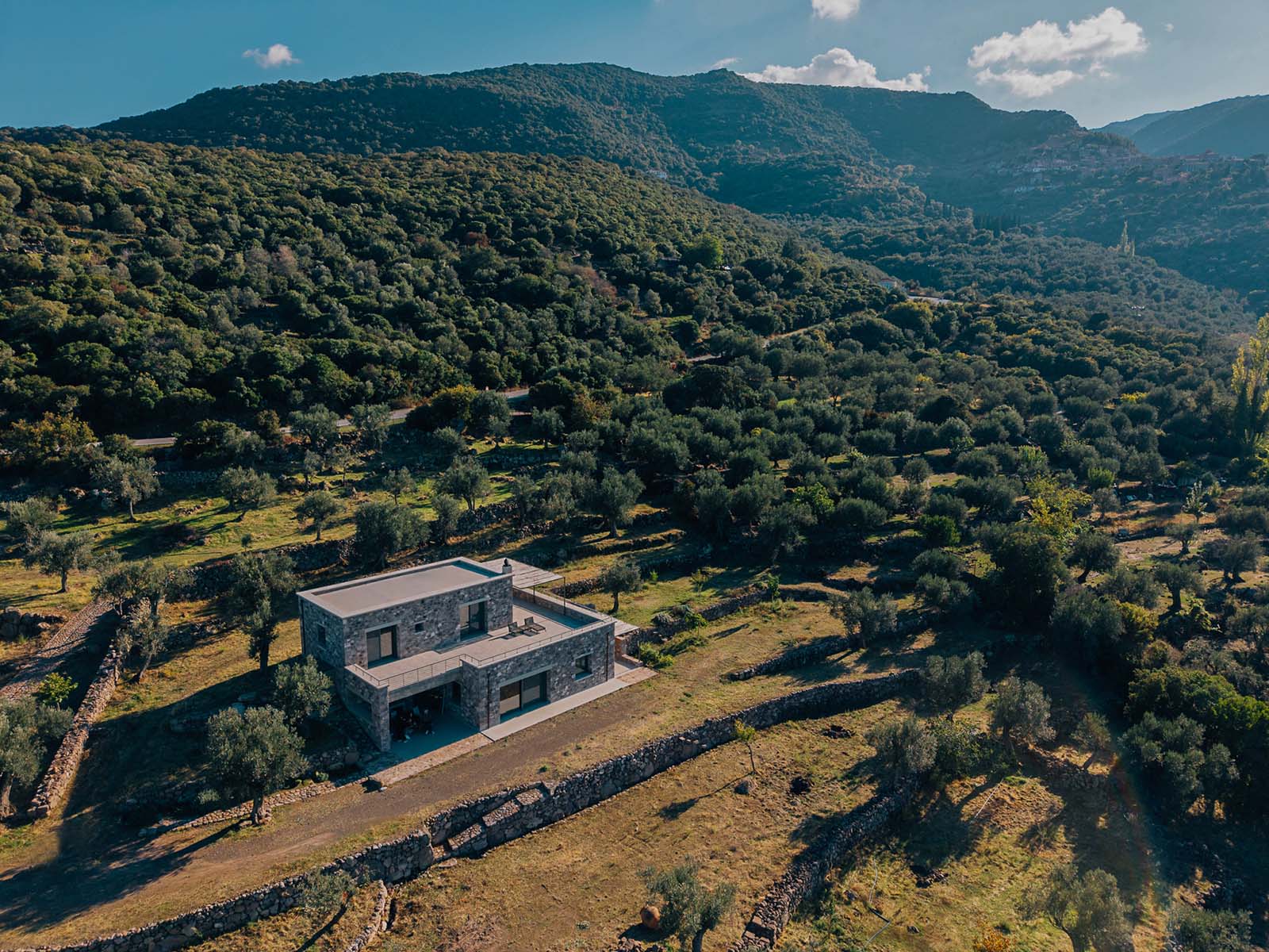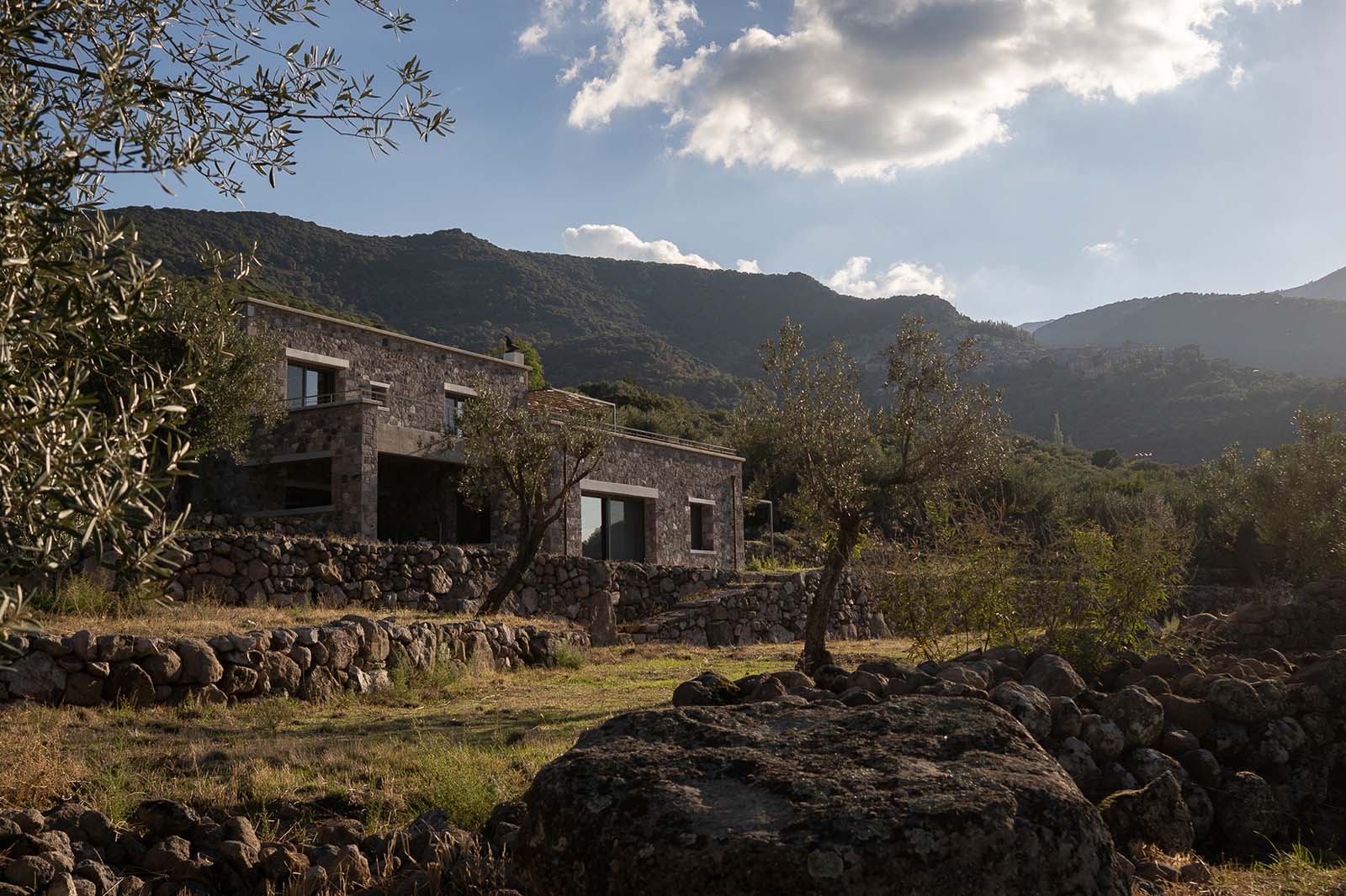 English description: On the island of Lesvos, close to the settlement of Sykamia, in an olive grove formed entirely by stone terraces of great aesthetic and historical value, architect Alexandra Kallitsa designed the Rachta Residence.