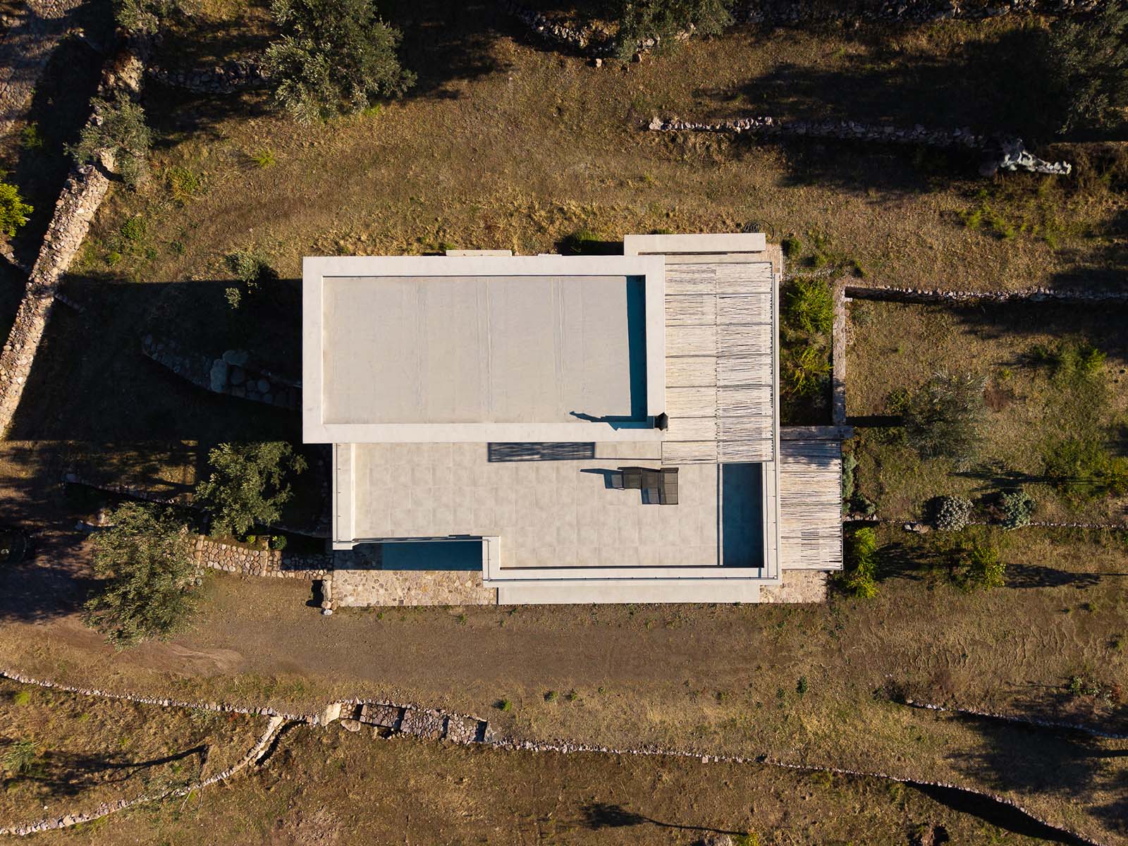 The architecture of the place is defined by the environmental interaction of the wind, water, stone, and olive trees that have been sculpting the landscape over the centuries. Hence, the concept was to design a house that becomes one with the environment, expanding the boundaries between landscape and building.