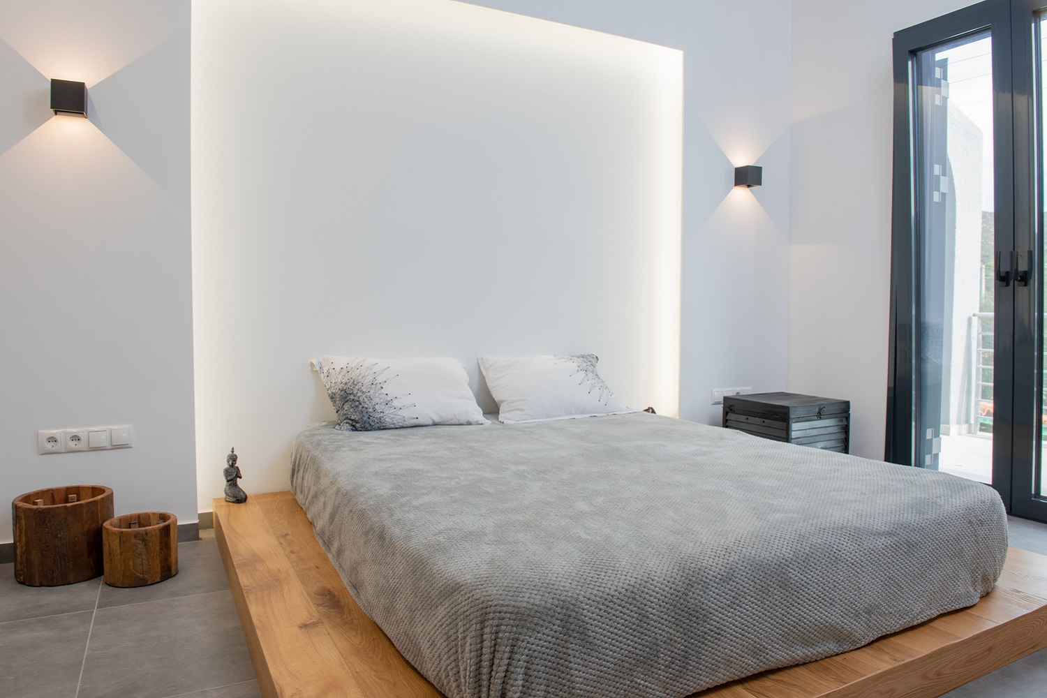 Γήινοι τόνοι και απλότητα επικρατούν στο χώρο του υπνοδωματίου με signature στοιχείο τη δημιουργία μιας εσοχής, όπου τοποθετείται το κρεβάτι και λειτουργεί ως φυσικό κεφαλάρι με κρυφό φωτισμό, προσδίδοντας μια χαλαρωτική αίσθηση στο χώρο.