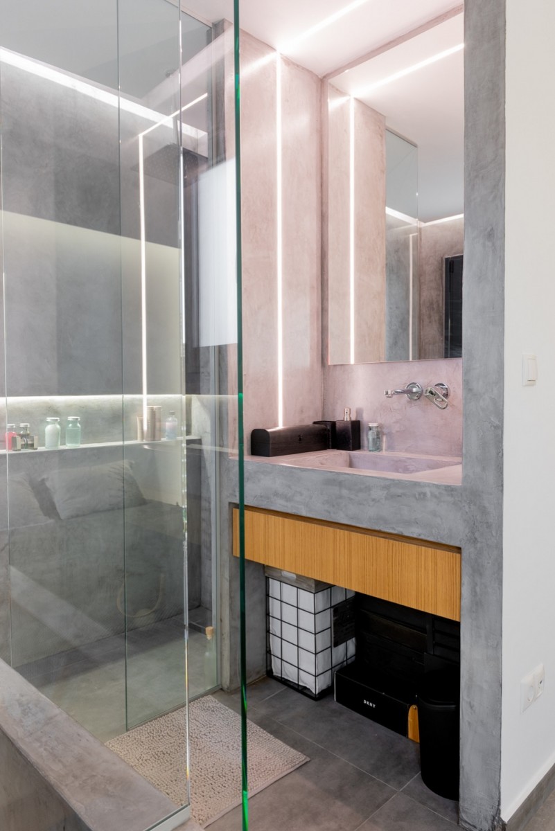Στον τοίχο του χτιστού νιπτήρα τοποθετήθηκε χωνευτό γραμμικό φωτιστικό σε σχήμα Γ, ενώ το λουτρό ουσιαστικά διχοτομείται με ένα χτιστό ράφι με εσοχή και κρυφό φωτισμό κατά μήκος της ντουζιέρας.