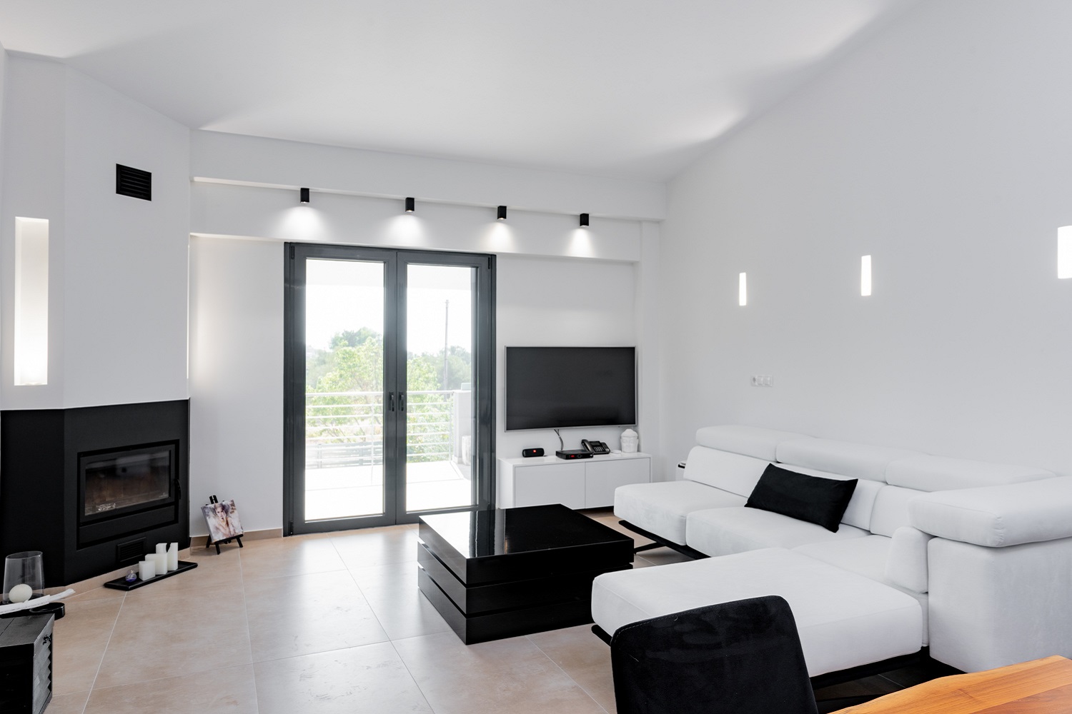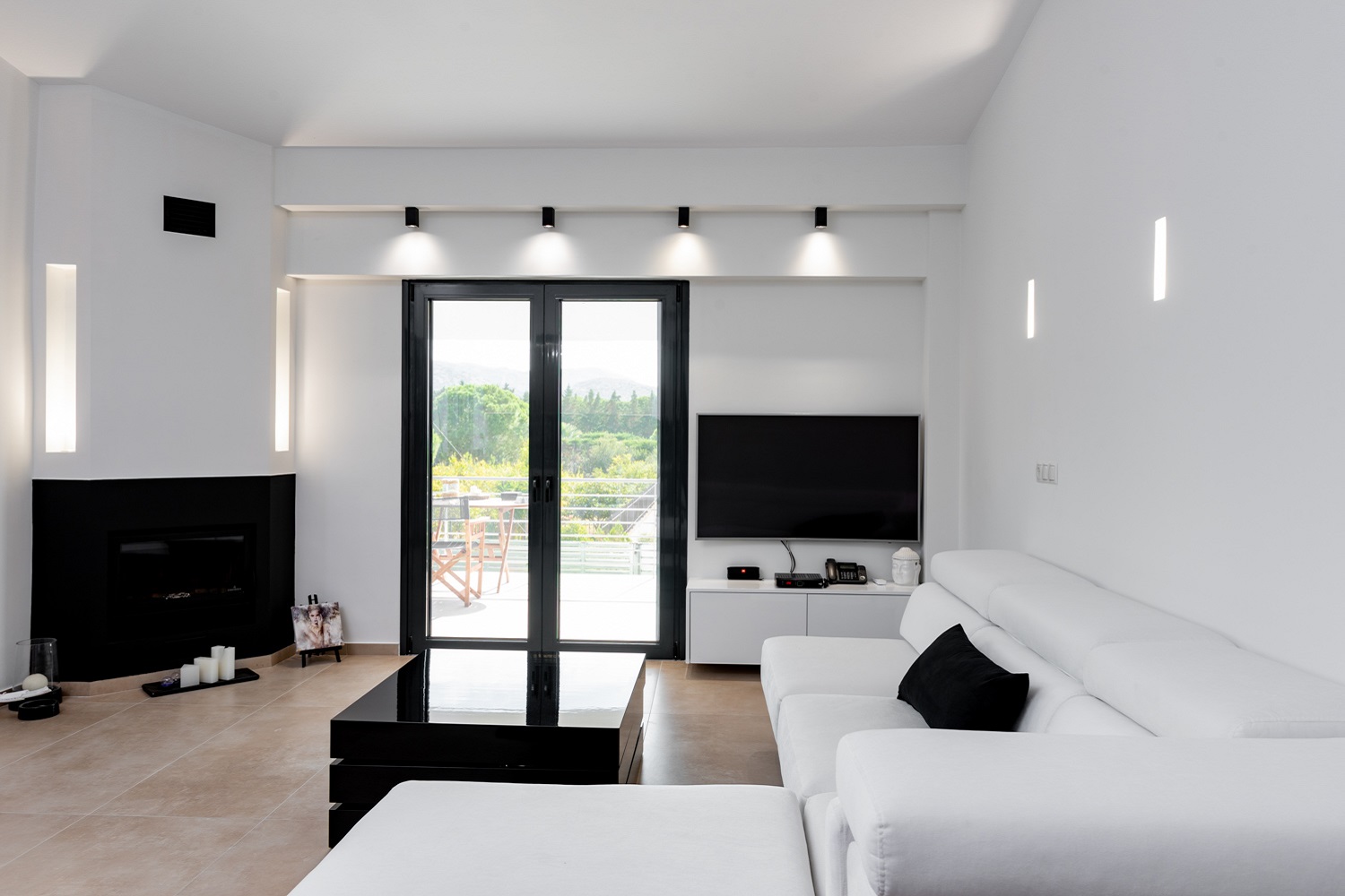 Με έμφαση στον φωτισμό, στον κεντρικό τοίχο του καθιστικού αλλά και το τζάκι, τοποθετήθηκαν γύψινες χωνευτές απλίκες τοίχου, που δημιουργούν ζεστή ατμόσφαιρα, αίσθηση ηρεμίας και απλότητας αλλά ταυτόχρονα προσφέρουν επάρκεια φωτισμού. Το αποτέλεσμα ενισχύεται με τα σπότ φωτιστικά οροφής που διαχέουν αρμονικά το φως στον χώρο, χωρίς να είναι απαραίτητος ένας κεντρικός φωτισμός.