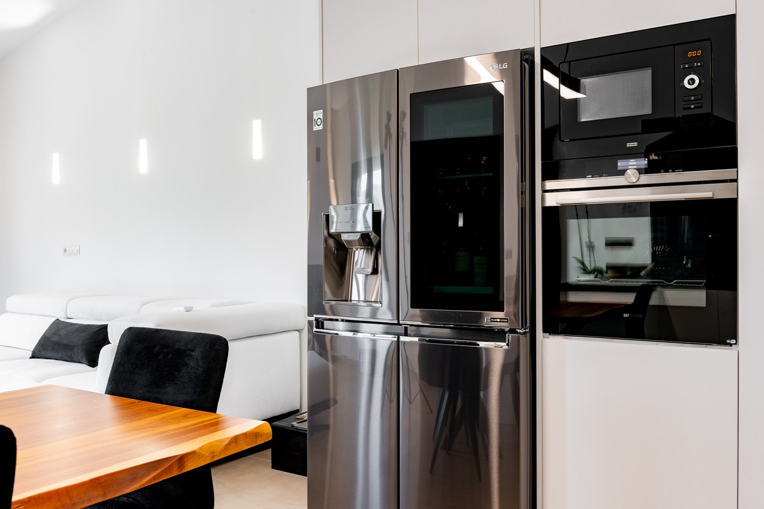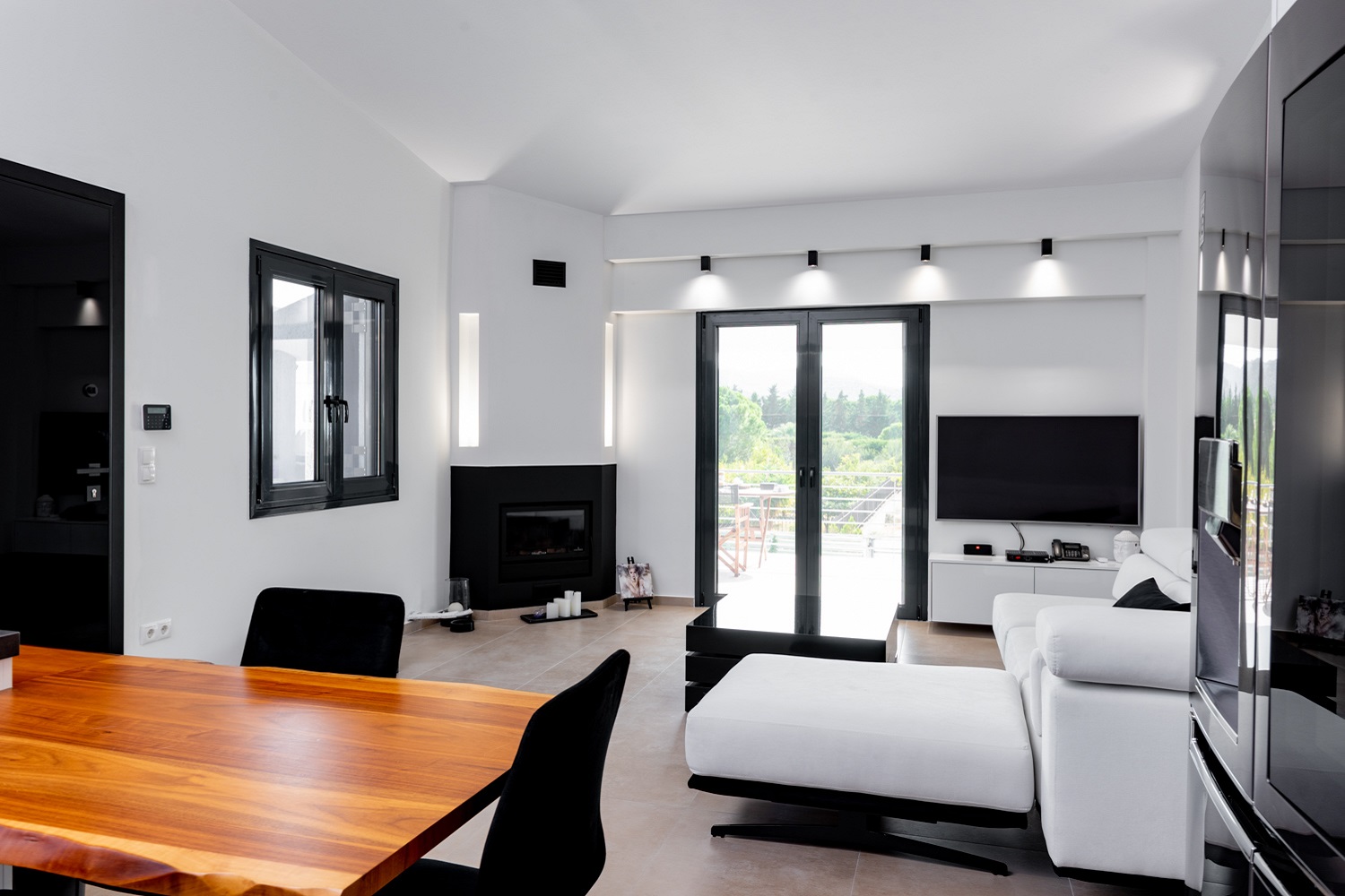 Στο καθιστικό, οι λευκοί τόνοι στους τοίχους και τον μεγάλο άνετο καναπέ, εναλλάσσονται με τις μαύρες προσθήκες στα κουφώματα, τις γυάλινες πόρτες και το νέο τζάκι του διαμερίσματος, επενδυμένο με πυροσανίδα. Η ασπρόμαυρη λογική του καθιστικού, ακολουθείται και στην ενιαία κουζίνα του διαμερίσματος με την προσθήκη αποχρώσεων ξύλου, ώστε να ζεστάνει ο χώρος, τόσο στα ντουλάπια της κουζίνας, όσο και στο ξύλινο τραπέζι από καρυδιά.
