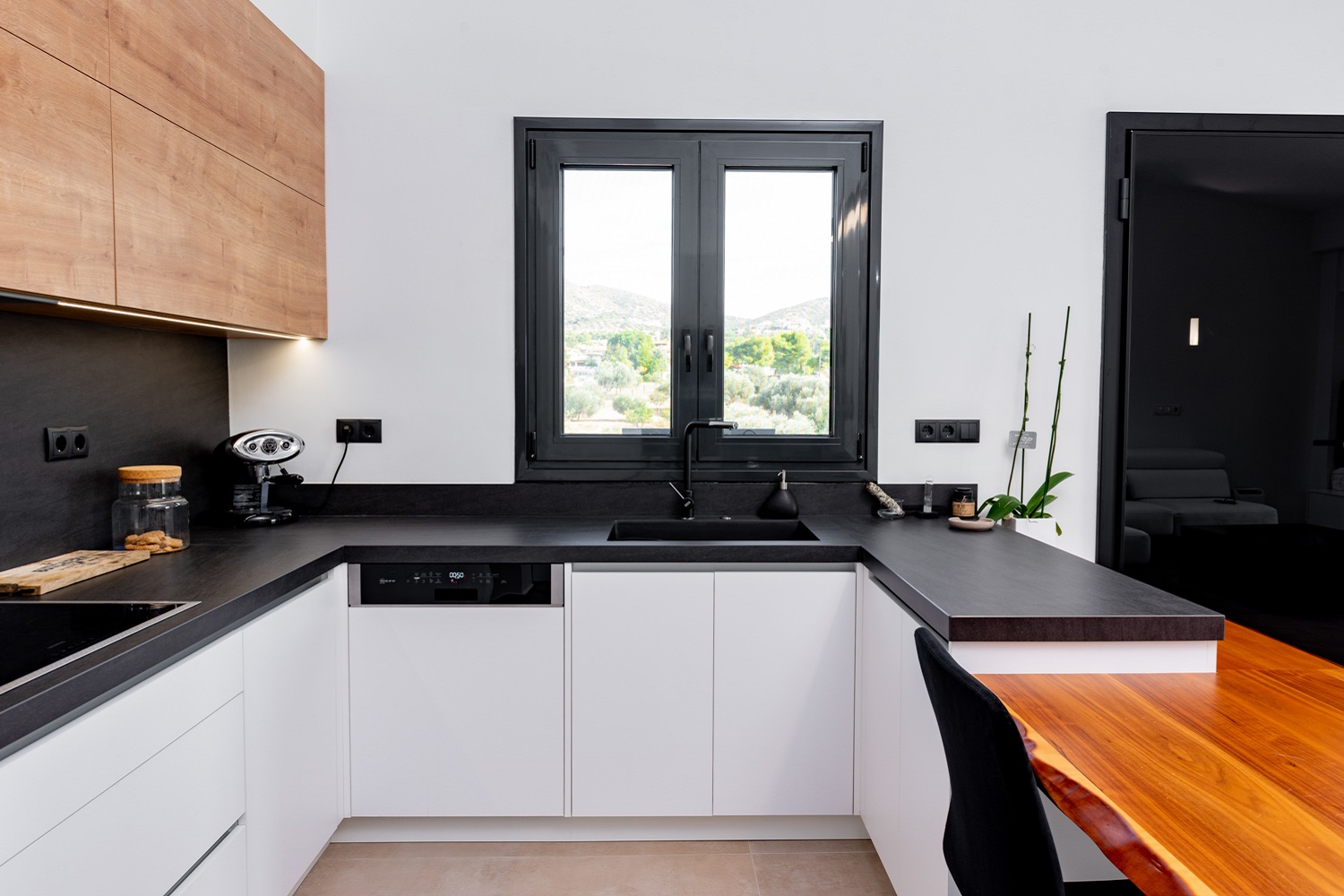 Ο μαύρος πάγκος της κουζίνας επεκτείνεται και μετατρέπεται σε ένα λειτουργικό και άνετο πάσο φαγητού. Ταυτόχρονα, με αυτόν τον τρόπο, δημιουργήθηκαν «ζώνες» – ως φυσικά σύνορα – που χωρίζουν τον μεγάλο ενιαίο χώρο.