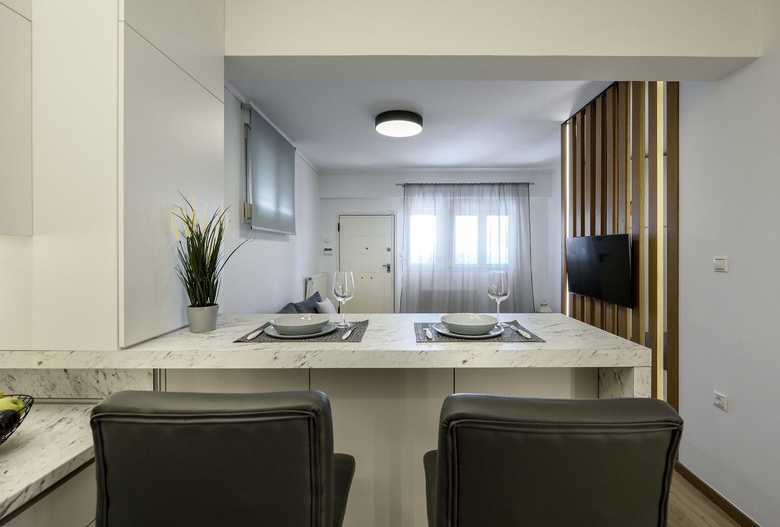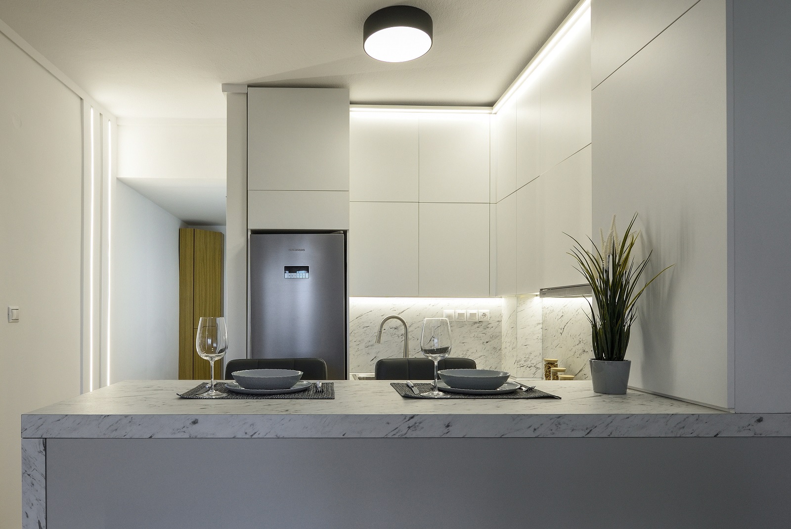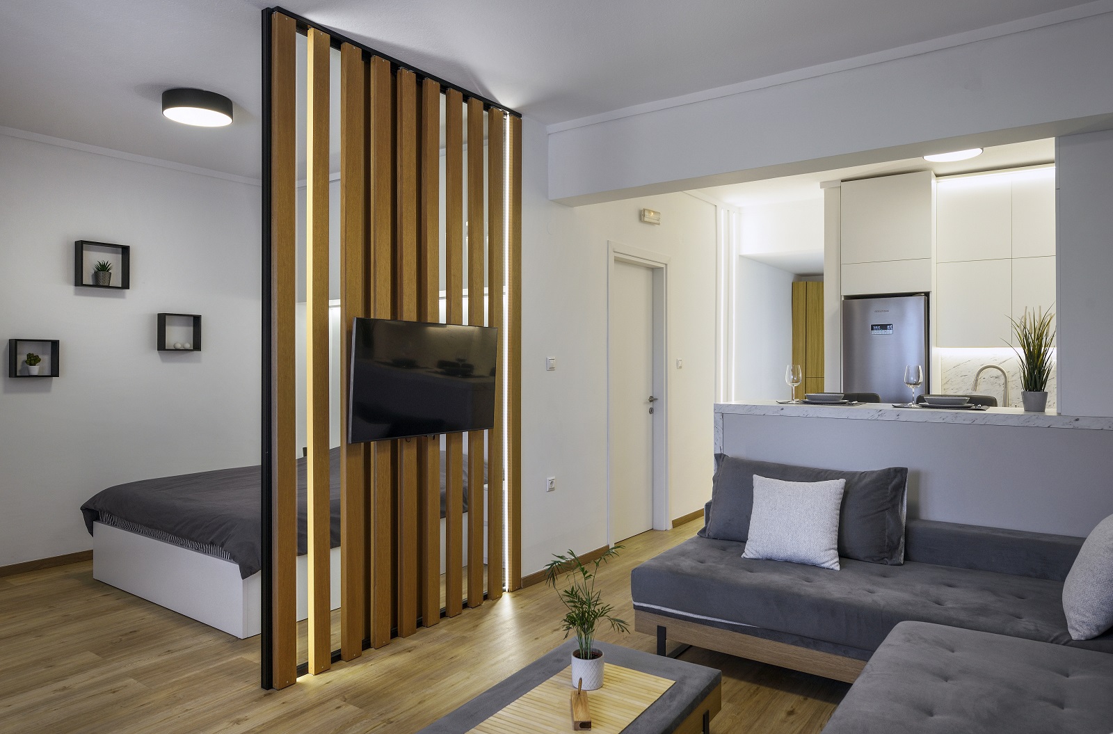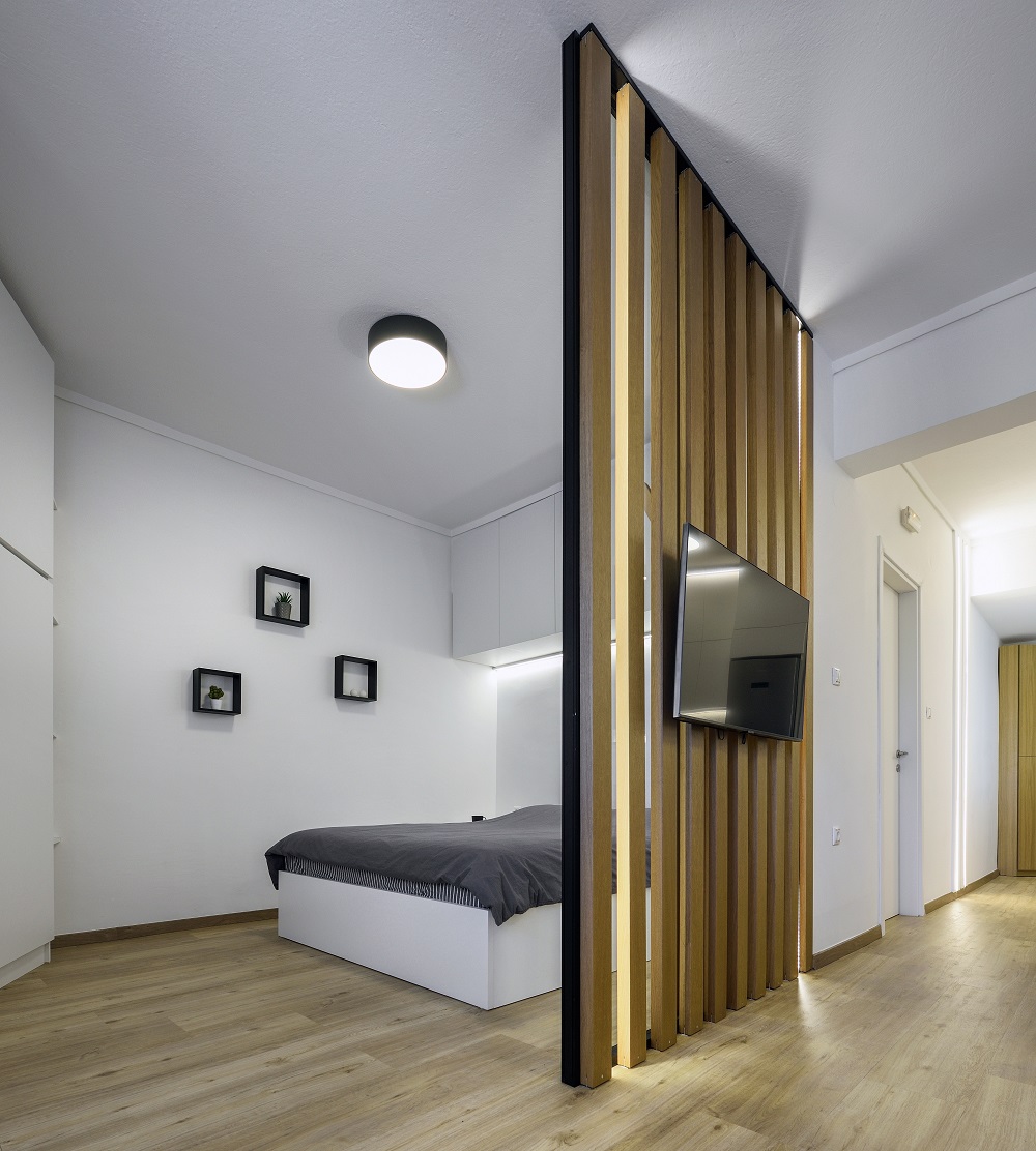 Λειτουργικά, οι χώροι αναπτύσσονται σε μια ενοποιημένη αλλά και με ιδιωτικότητα μορφή, διαχωρίζοντας την λειτουργία της διημέρευσης από αυτήν του ύπνου με ένα ημιδιαφανο και αμφίπλευρο στοιχείο που δρα ως το επίκεντρο της κατοικίας, ενώνοντας, χωρίζοντας και επικρατώντας λειτουργικά και αισθητικά. Ομοίως διαχωρίζεται η κουζίνα με μια ψηλή νησίδα, επαναλαμβάνοντας και εδώ την έννοια της «διαφανούς ιδιωτικότητας». Στο βάθος του διαμερίσματος, όπου ένας επιμήκης διάδρομος οδηγεί στους βοηθητικούς χώρους, μια συστάδα γραμμικών φωτιστικών led ξεδιπλώνει μια νέα κατεύθυνση κι ενδιαφέρον σε μια ακόμη πλευρά του χώρου, αναβαθμίζοντας το λιγότερο ευνοημένο λειτουργικά και χωρικά τμήμα του διαμερίσματος.