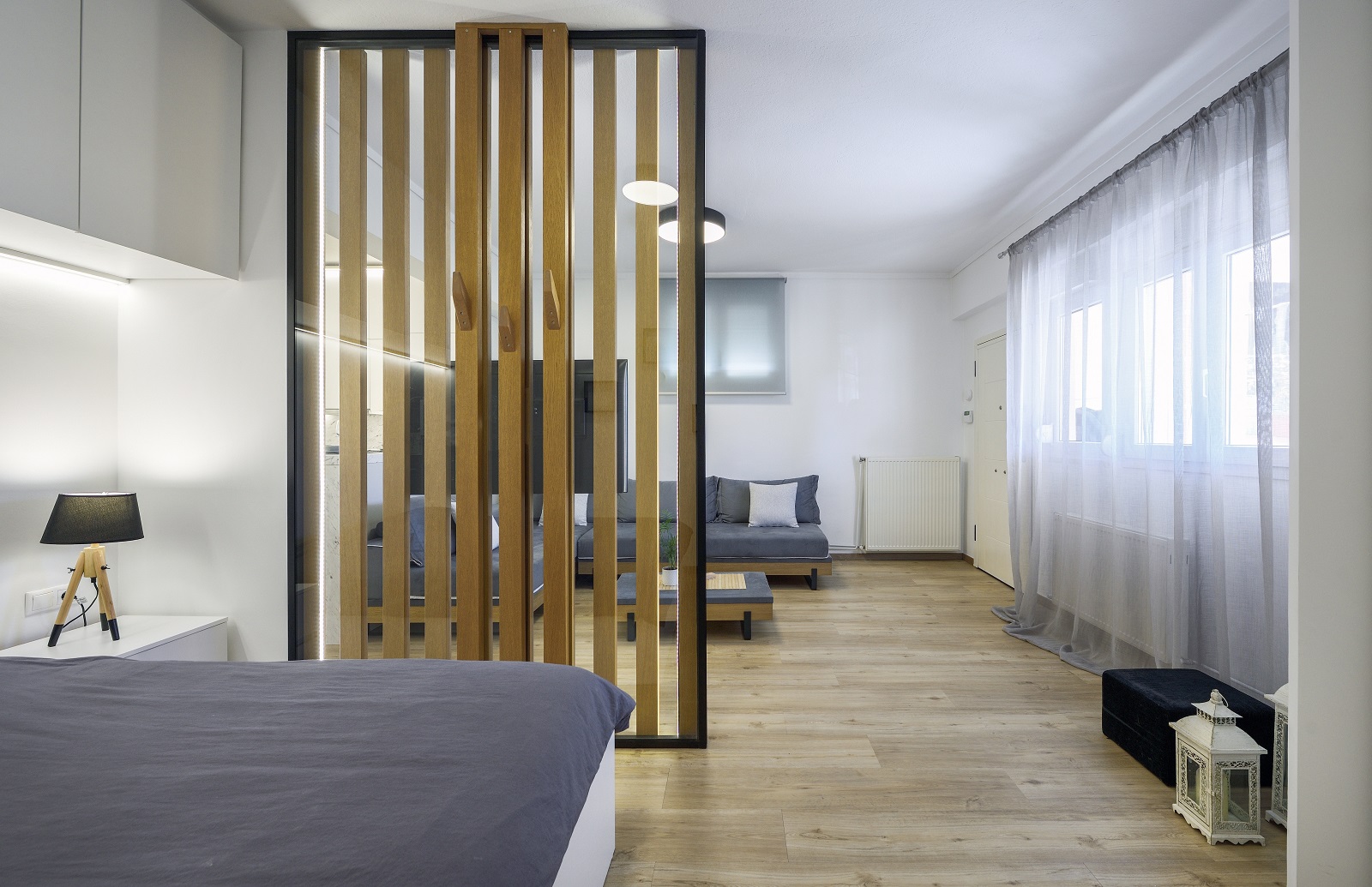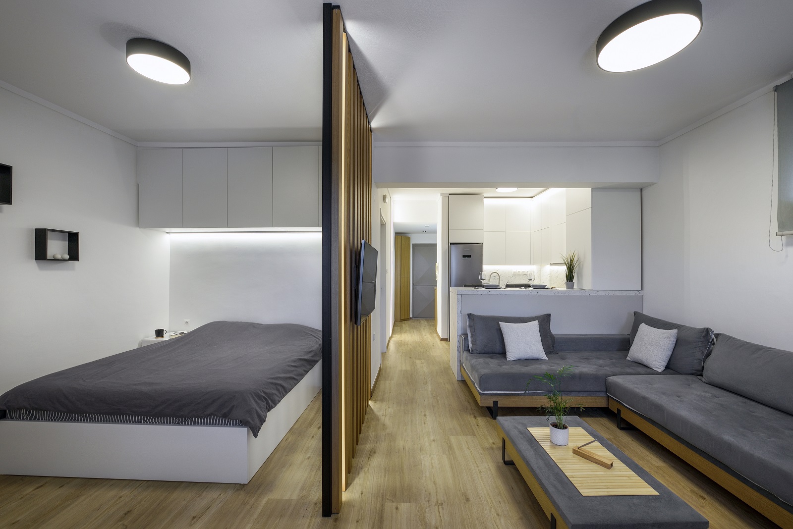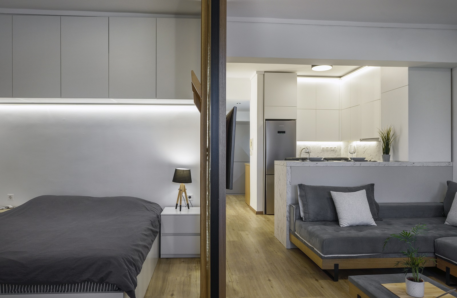 Ζητούμενο της παρούσας μελέτης, που παρουσίαζει η αρχιτέκτονας Κατερίνα Δανελάκη, αποτέλεσε η αυτονόμηση και η μέγιστη αξιοποίηση του ενιαίου χώρου επιφάνειας 60 τ.μ., ο οποίος ευρισκόμενος στο ισόγειο τριώροφης ενιαίας μονοκατοικίας, αυτονομήθηκε, με σκοπό να διαμορφωθεί σε μια πλήρη, σύγχρονη και άνετη κατοικία.