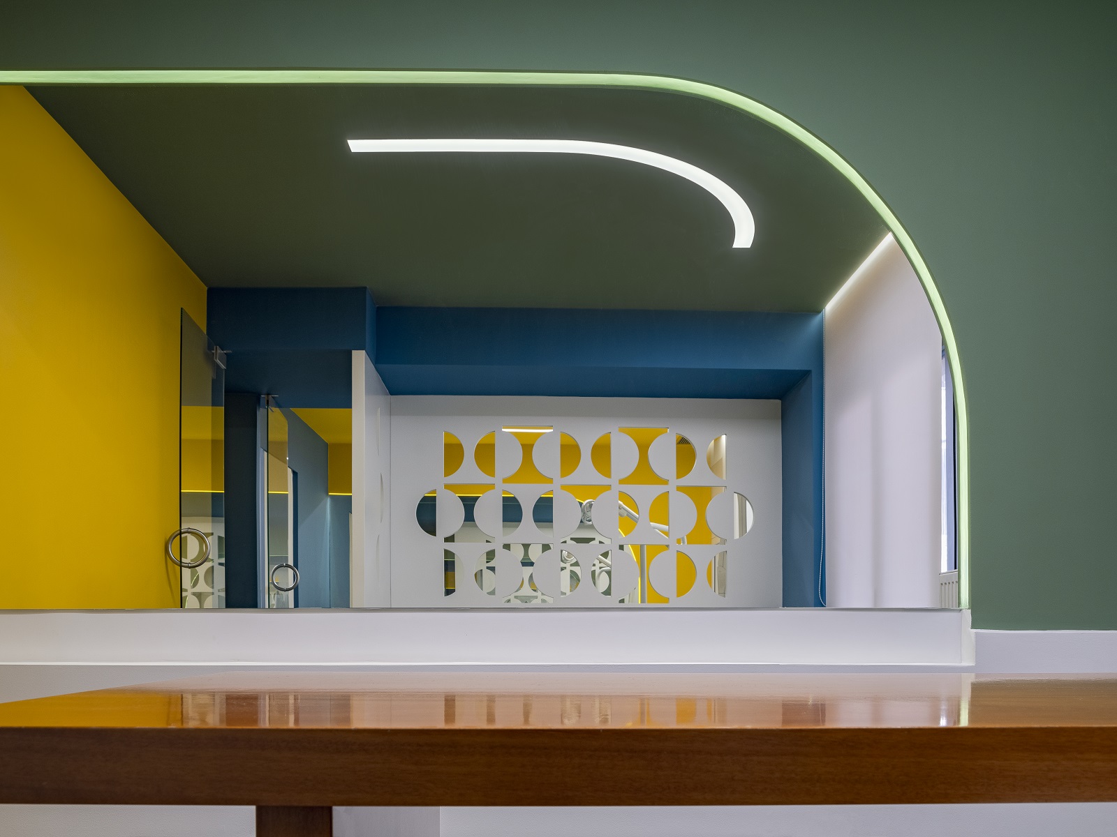 Προβάλλουν χρώματα σε άλλα χρώματα και περιβάλλοντα σε άλλα περιβάλλοντα, διευρύνοντας έτσι την προοπτική του χώρου. Στους τοίχους, οι καμπυλωτές δρύινες επενδύσεις αγκαλιάζουν τα γεωμετρικά τσιμεντένια πλακάκια. Και από πάνω «ξεπροβάλλουν» οι αρθρωτές πτυχώσεις των ψευδοροφών, που τονίζονται από φωτεινά εφέ.