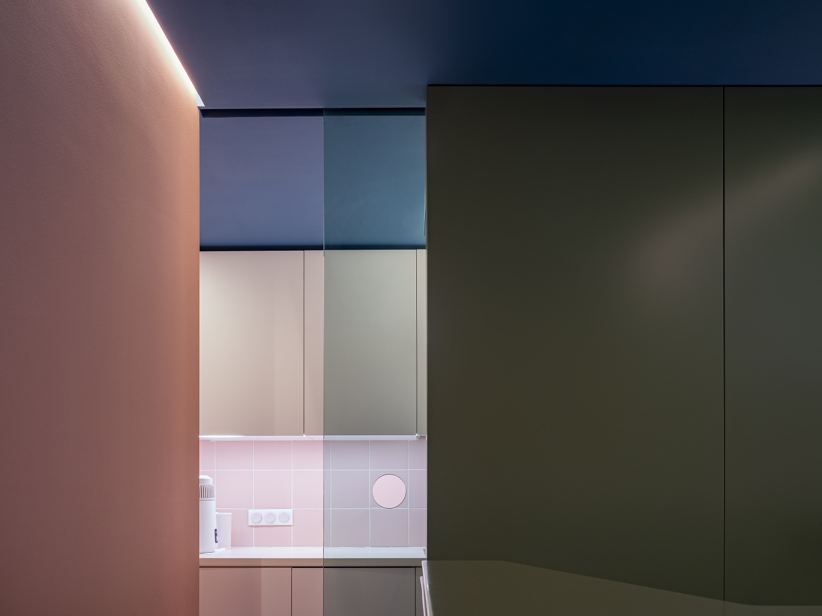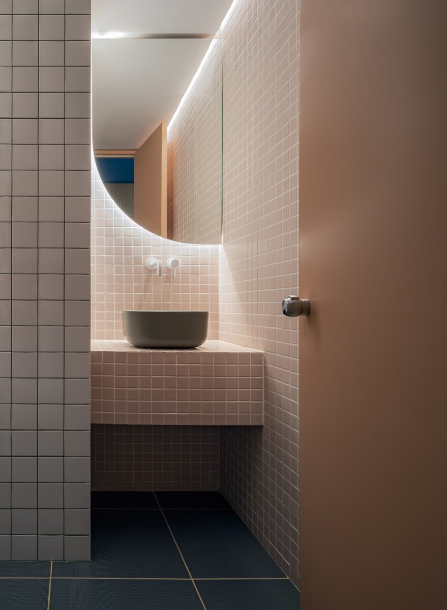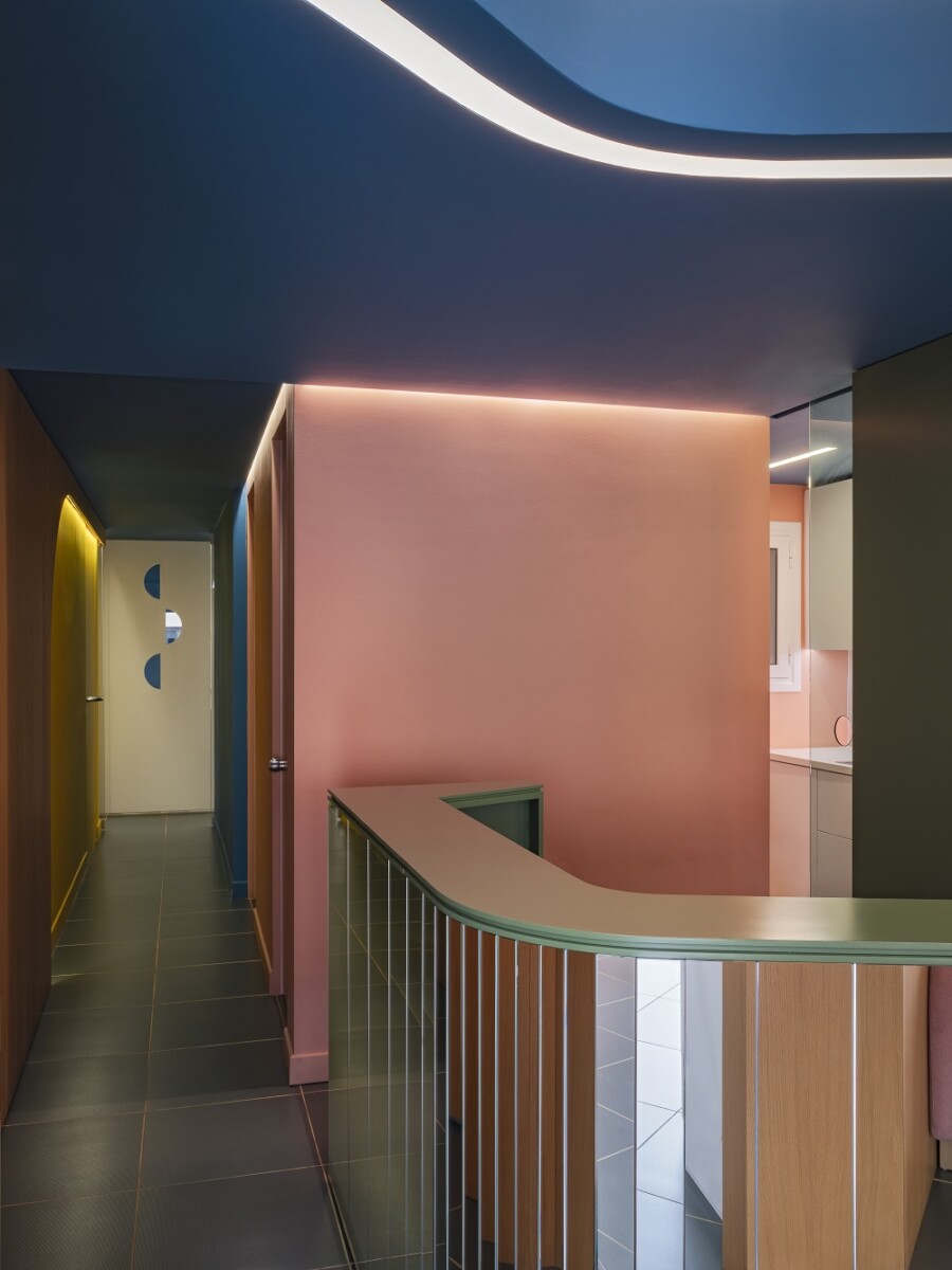 Το κροκί, το λαδί, το πετρόλ και το ροζ συμπληρώνουν το ένα το άλλο για να ζωντανέψουν τοίχους και οροφές, τονίζοντας το παιχνίδι των κλιμακωτών επιπέδων και καμπυλών. Αυτό που προτείνει η Μπέλα Λουλουδάκη είναι η απόλυτη βύθιση σε έναν πολύπλευρο χρωματικό ορίζοντα που ωθεί το μάτι να μετακινείται συνεχώς από το ένα σημείο στο άλλο.