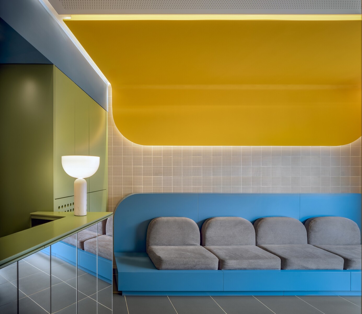 Ο χώρος φιλοξενεί μια σειρά από καθίσματα που έχουν σχεδιαστεί κατά παραγγελία, και ένα καμπυλωτό έπιπλο (ρεσεψιόν) επενδεδυμένο με κάθετους καθρέφτες διαφορετικού πλάτους, οι οποίοι με την επανάληψη τους προκαλούν ένα πολύ ενδιαφέρον παιχνίδι αντανακλάσεων.