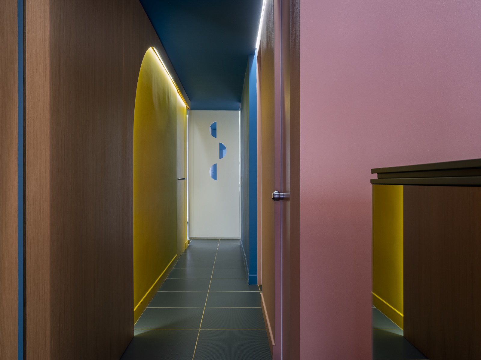 “Ο χρωματικός συνδυασμός συνεχίζεται άφοβα και στον διάδρομο, συμπεριλαμβάνοντας πόρτες που σχεδόν εξαφανίζονται από το εφέ καμουφλάζ των χρωμάτων. Λευκά διάτρητα πάνελ, διαχωρίζουν ανάλαφρα τους πίσω χώρους και συνυπάρχουν δυναμικά με τα υπόλοιπα χρώματα. Ακόμη και το απόλυτο λευκό των αποστειρωμένων χειρουργικών αιθουσών συνυπάρχει σε κάποια σημεία με χρώμα”.