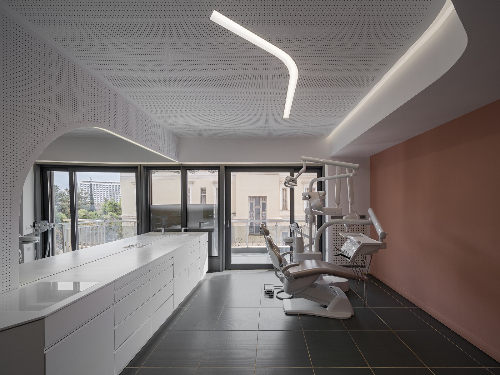 Το οδοντιατρείο, βρίσκεται στο Κολωνάκι, ακριβώς μπροστά από το νοσοκομείο Ευαγγελισμός, που χτίστηκε το 1881 από τον αρχιτέκτονα Γεράσιμο Μεταξά. Ως φόρο τιμής στο κτίριο του 19ου αιώνα, η Μπέλα Λουλουδάκη αποφάσισε να διαμορφώσει τη χωροταξική διάταξη των δωματίων με τέτοιο τρόπο ώστε να αφήνει ανεμπόδιστη τη θέα προς την πρόσοψη και να την καθιστά κατά κάποιο τρόπο μέρος του έργου.
