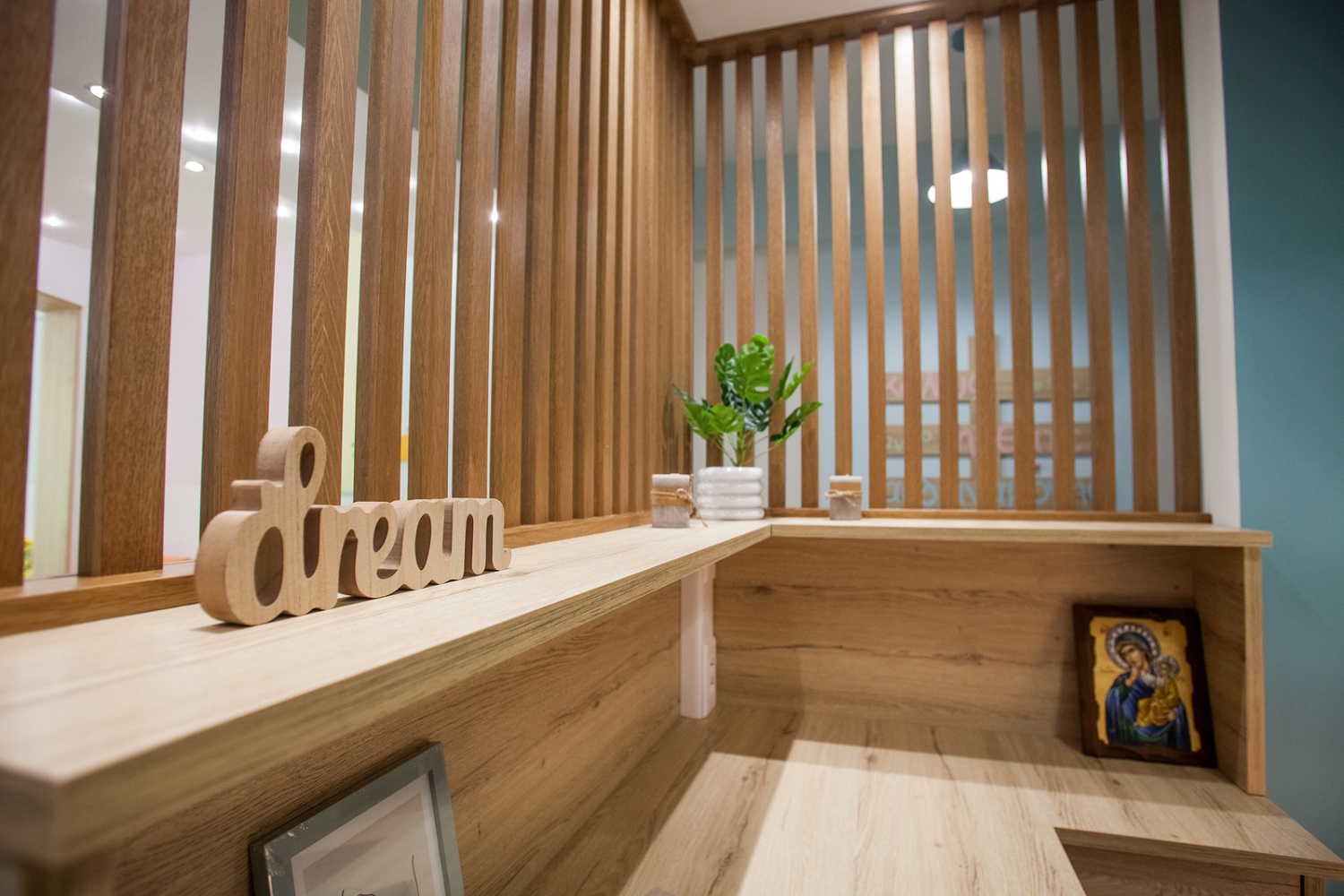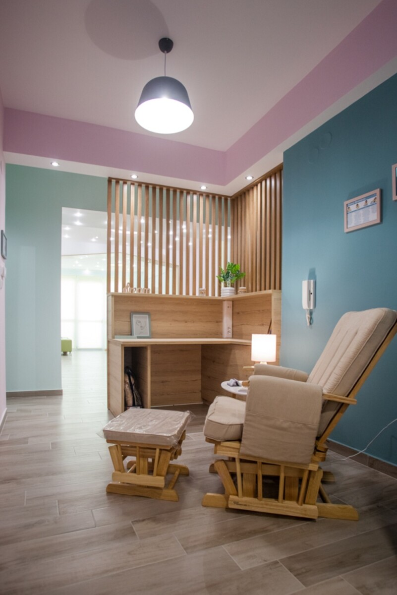 Τα παστελ χρώματαστους τοίχους και η προσεκτική εξέταση του φωτισμού είναι ζωτικής σημασίας καθώς επηρεάζουν τη διάθεση και την άνεση των παιδιών και των ενηλίκων. Το κομψό γραφείο, τα άνετα καθίσματα και η ξεχωριστή βιβλιοθήκητου γραφείου καθώς και τα χρωματιστά καθίσματα της υποδοχής είναι από τη γνωστή και διακεκριμένη εταιρεία Sigma Office