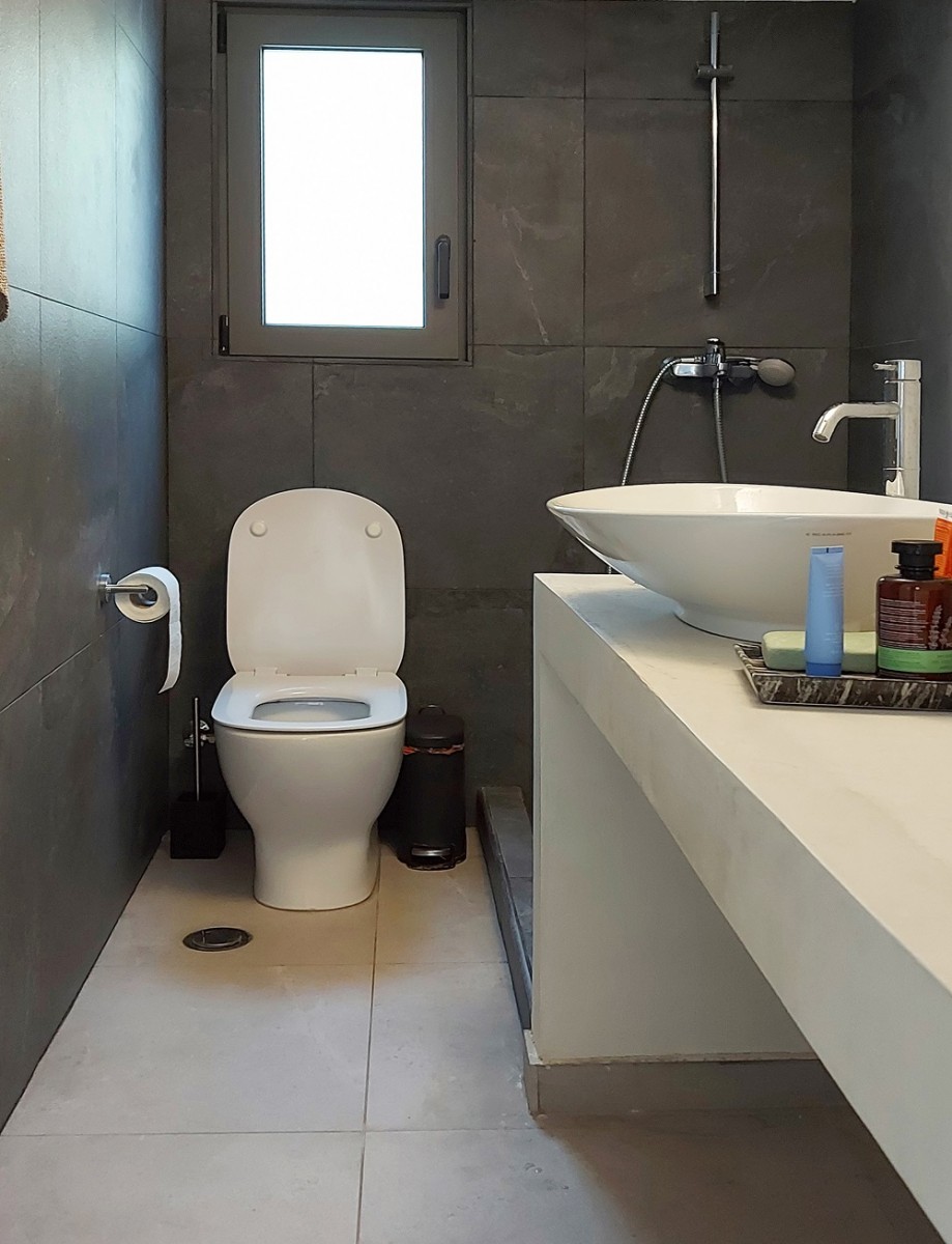 Το δεύτερο υπνοδωμάτιο, ενοποιημένο με το πρώην δωμάτιο υπηρεσίας, λειτουργεί ως παιδικό δωμάτιο και γραφείο, ενώ στο μπάνιο έγινε πλήρης αναδιάταξη, με χρήση λευκού χτιστού πάγκου από τσιμεντοκονία και μαύρου ανάγλυφου κεραμικού πλακιδίου.