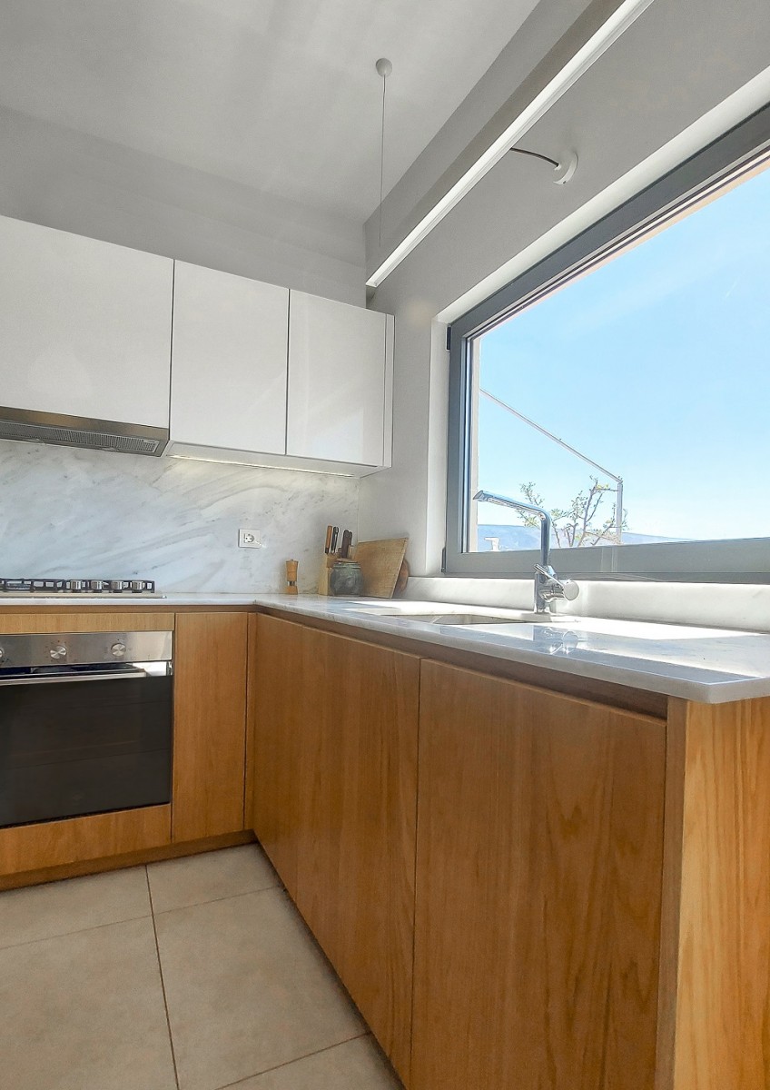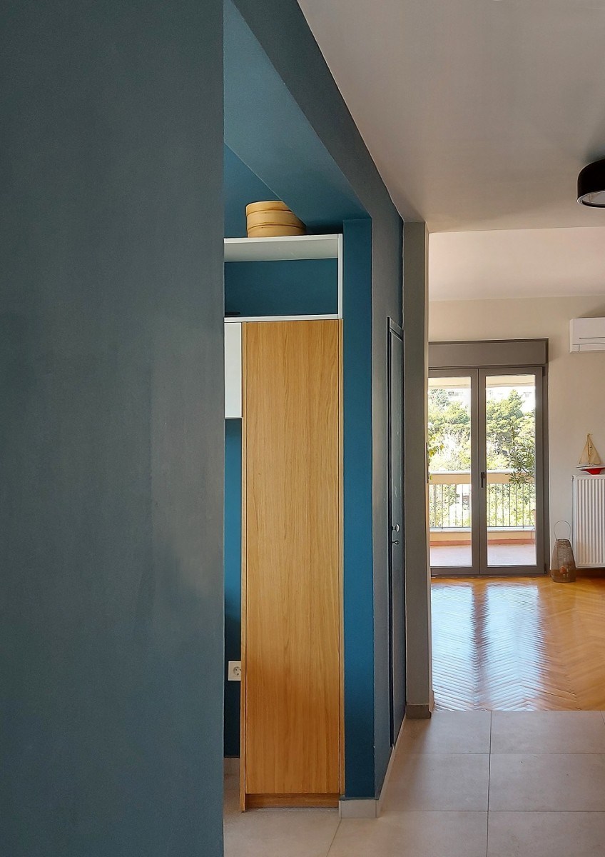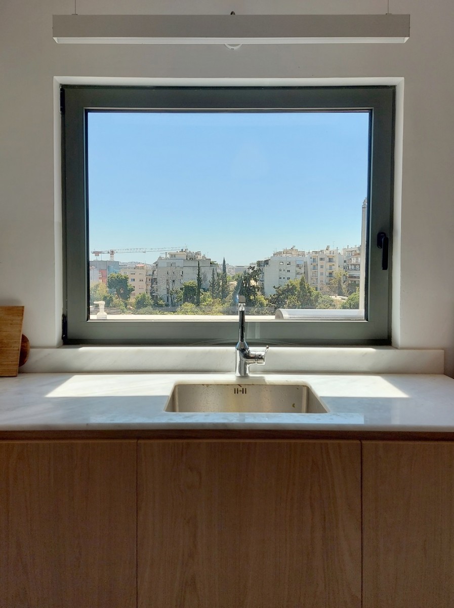 Οι λειτουργικές επεμβάσεις που έγιναν αποσκοπούσαν στην αναβάθμιση του χώρου με σύγχρονους όρους και στην ανάδειξη των στοιχείων ενδιαφέροντος του διαμερίσματος. Η κατάργηση του τοίχου της κουζίνας μπαίνοντας από την κύρια είσοδο, ενοποιεί λειτουργικά το χώρο και κατευθύνει το βλέμμα σε ένα άνοιγμα με θέα τον αστικό ορίζοντα, διαχέοντας το φως στο εσωτερικό.
