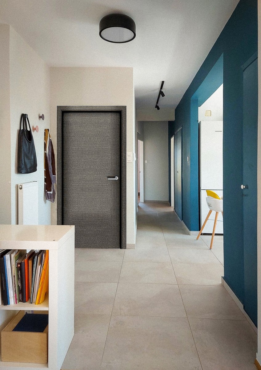 Οι επιπλέον παρεμβάσεις στην αρχική διαρρύθμιση του διαμερίσματος αφορούσαν στην ενοποίηση του παλιού δωματίου υπηρεσίας με το δεύτερο υπνοδωμάτιο και στην εξασφάλιση περισσότερων αποθηκευτικών χώρων.