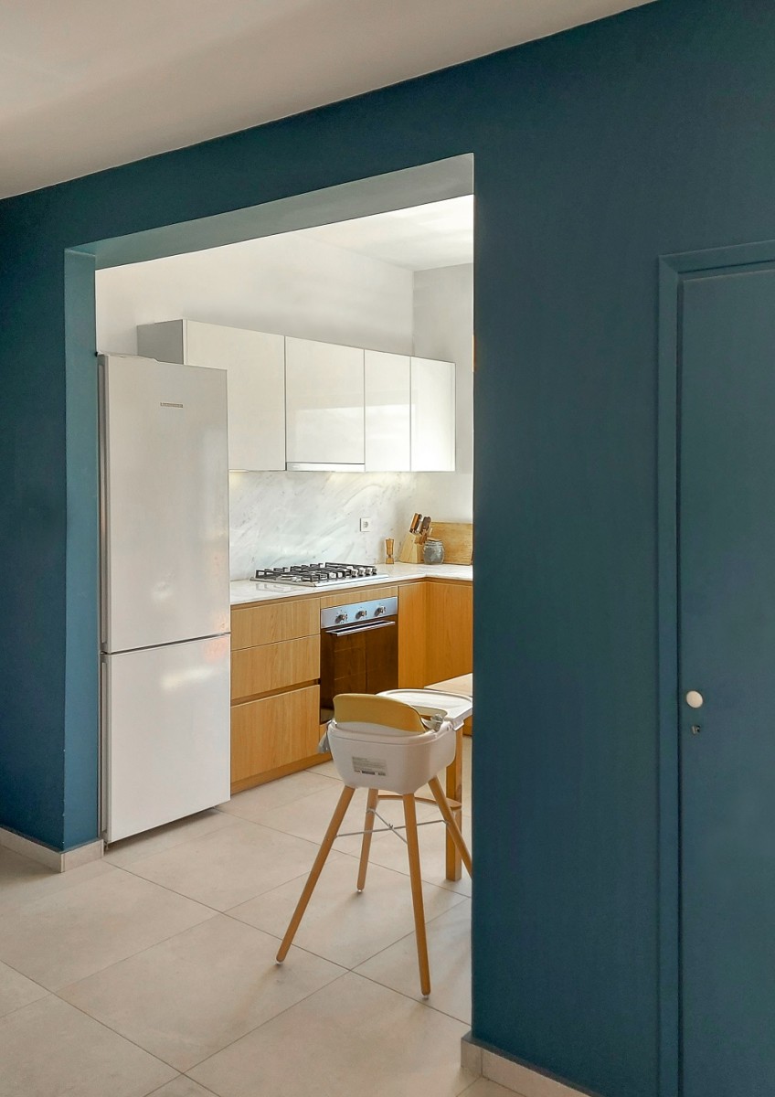 Η διαχρονική υλικότητα της κουζίναςμε φυσική δρυ, λευκή λάκα και μάρμαρο Διονύσου συνδιαλέγεται με το χαρακτηριστικό navyblue χρώμα του σπιτιού, που μέσα από την αντίθεση και την ένταση που δημιουργεί, λειτουργεί σαν συνδετικό στοιχείο με τα υπόλοιπα φυσικά υλικά.