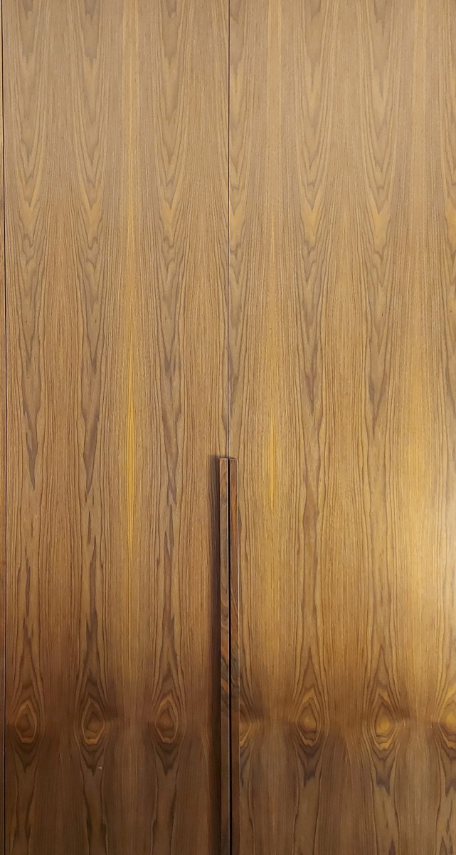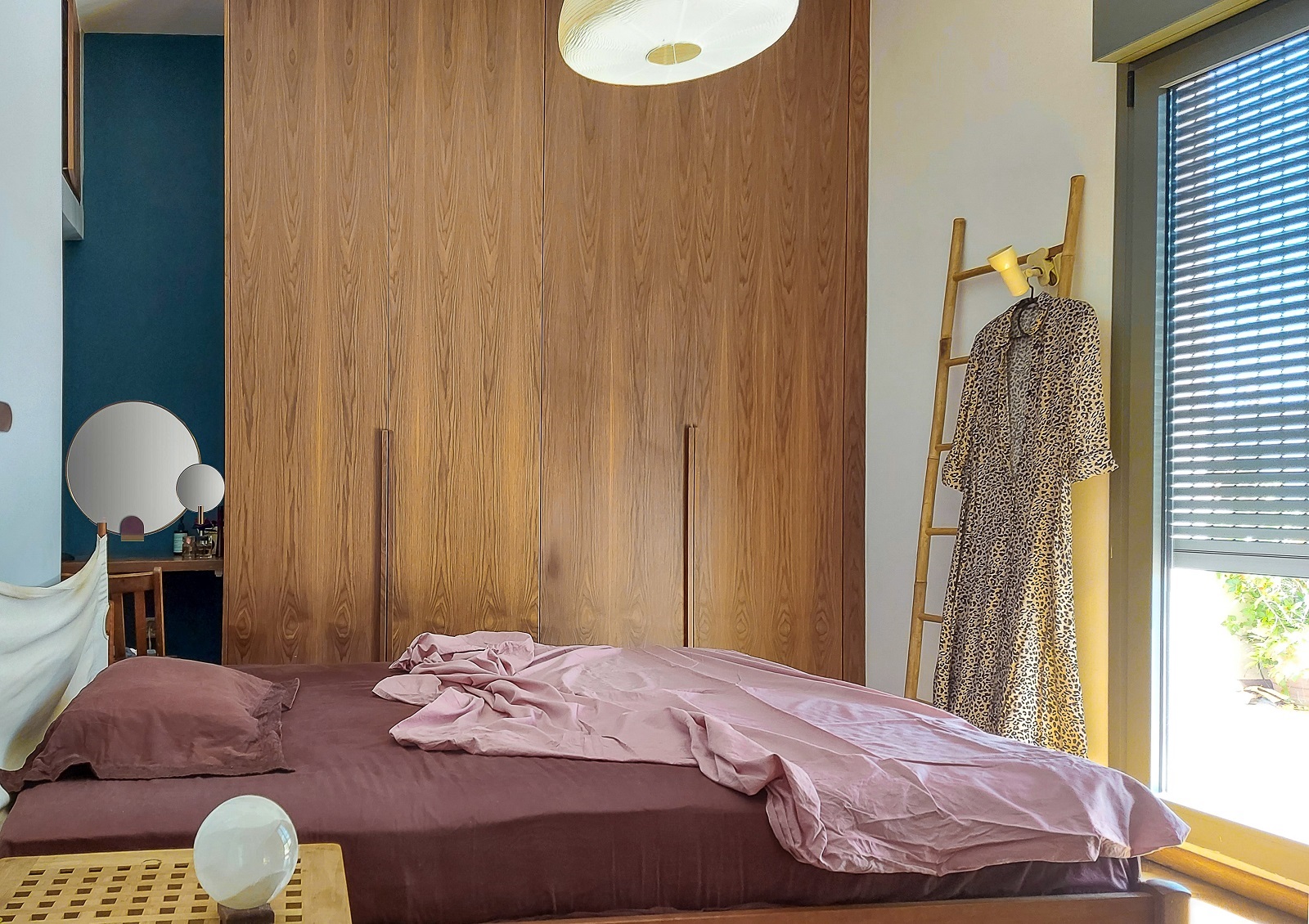 “Στο ένα υπνοδωμάτιο χρησιμοποιείται καρυδιά και καθρέφτης για δημιουργία νέων αποθηκευτικών χώρων παίζοντας με την υλικότητα και την αντανάκλαση του βλέμματος”.
