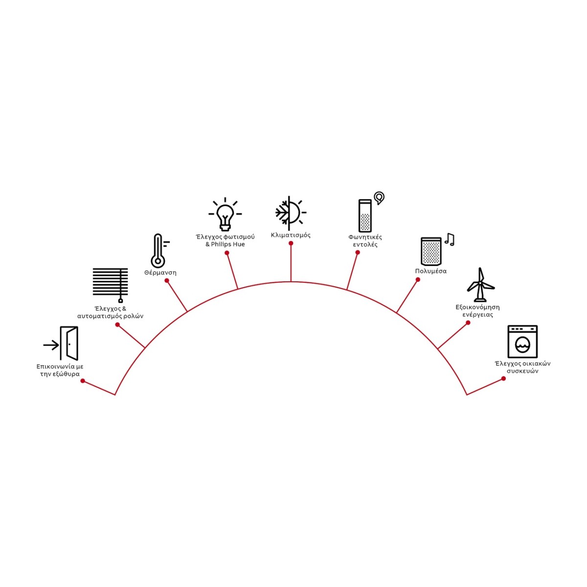 “Ο έλεγχος του φωτισμού, των ρολών και των μηχανισμών σκίασης, η θέρμανση, ο κλιματισμός και η επικοινωνία με την εξώθυρα γίνονται εύκολα και προσαρμόζονται στις ανάγκες σας”.