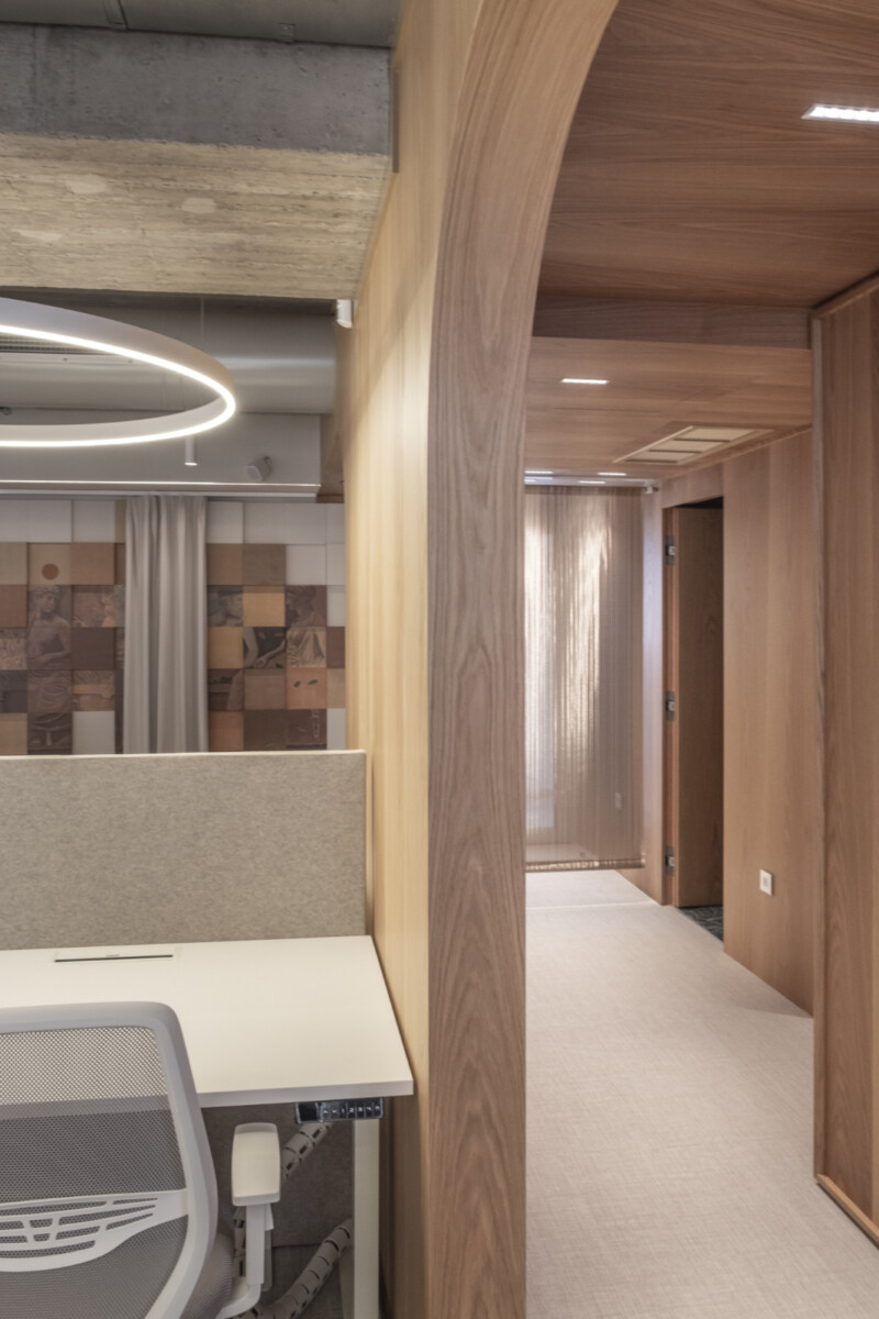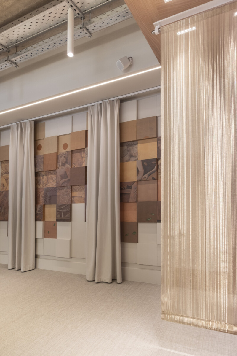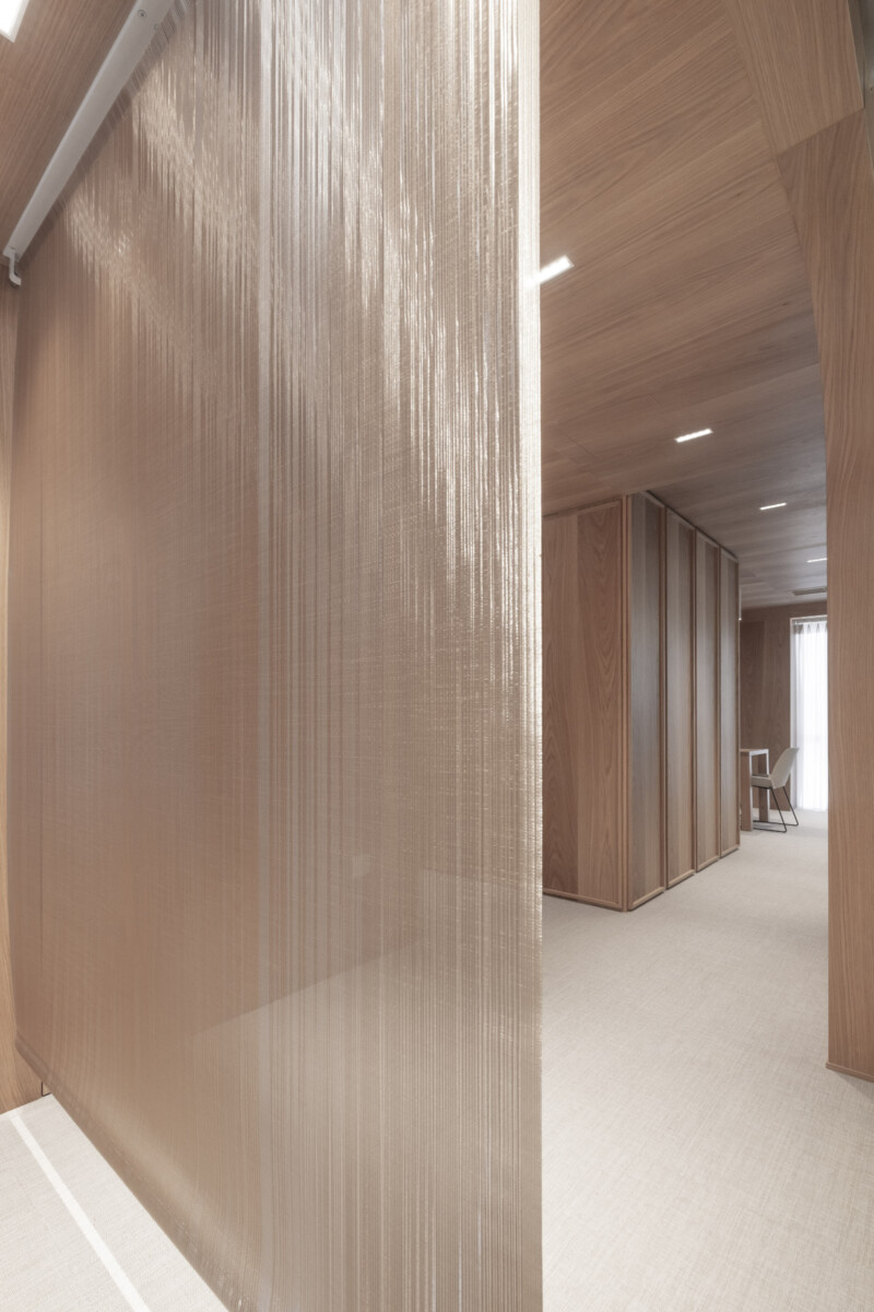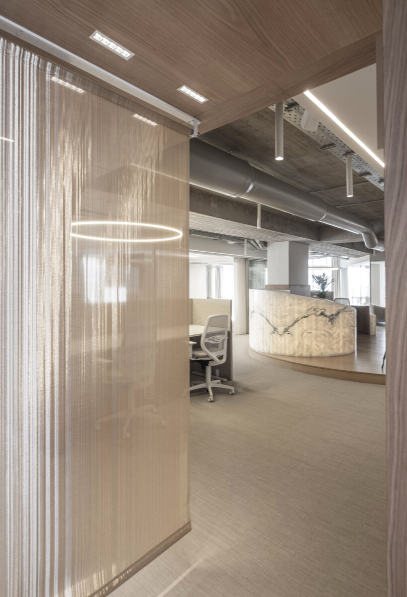 A fundamental distinction is made between main and auxiliary spaces, signified through material selection. The primary and more communal areas are unified through the exposure of the concrete ceiling while also being dressed in white velvet curtains that extend from ceiling to floor. Conversely, the auxiliary rest and break areas are sculpted within a “wooden universe”. The use of wood evokes tranquility and expresses the company’s care and consideration for its people. Upon entering the offices, the semi-transparent boundary of the woven metal curtain guides the visitor toward the reception area.