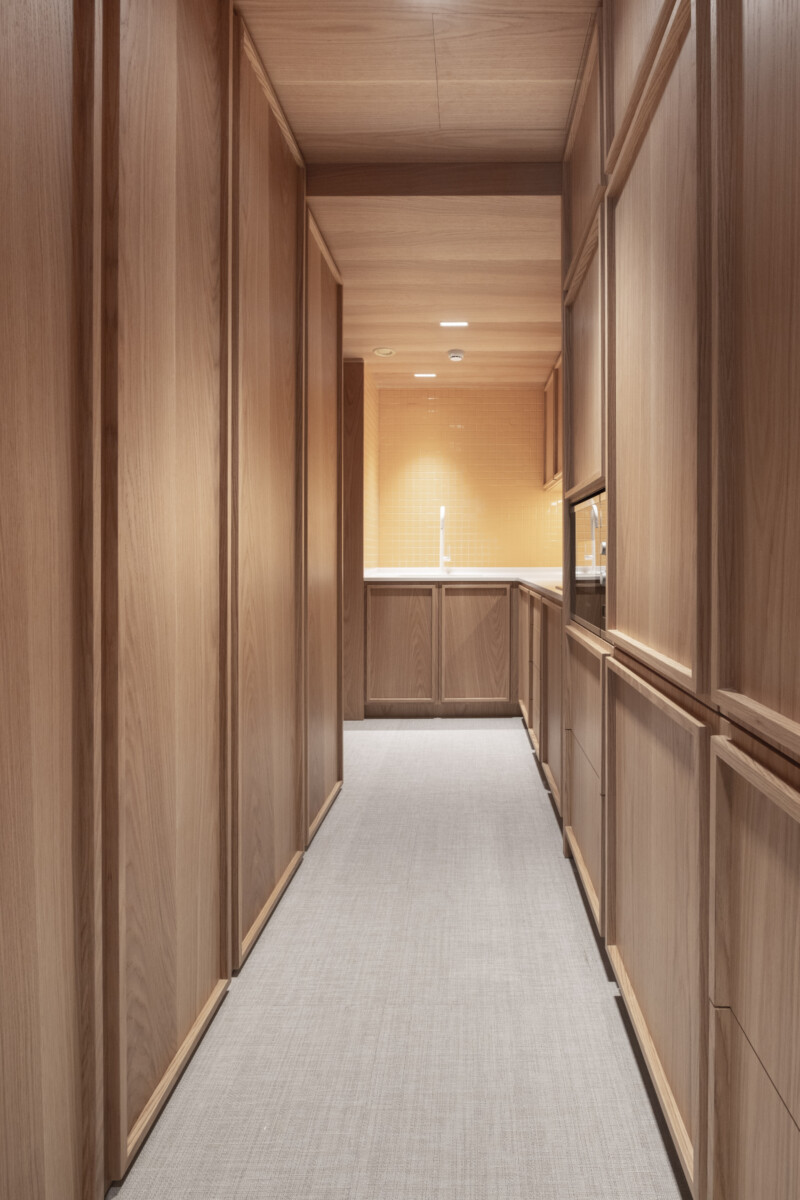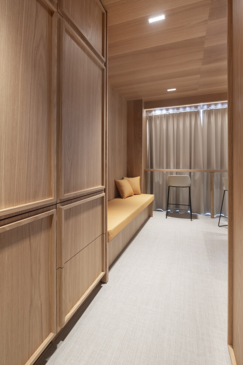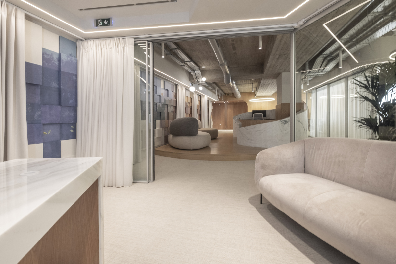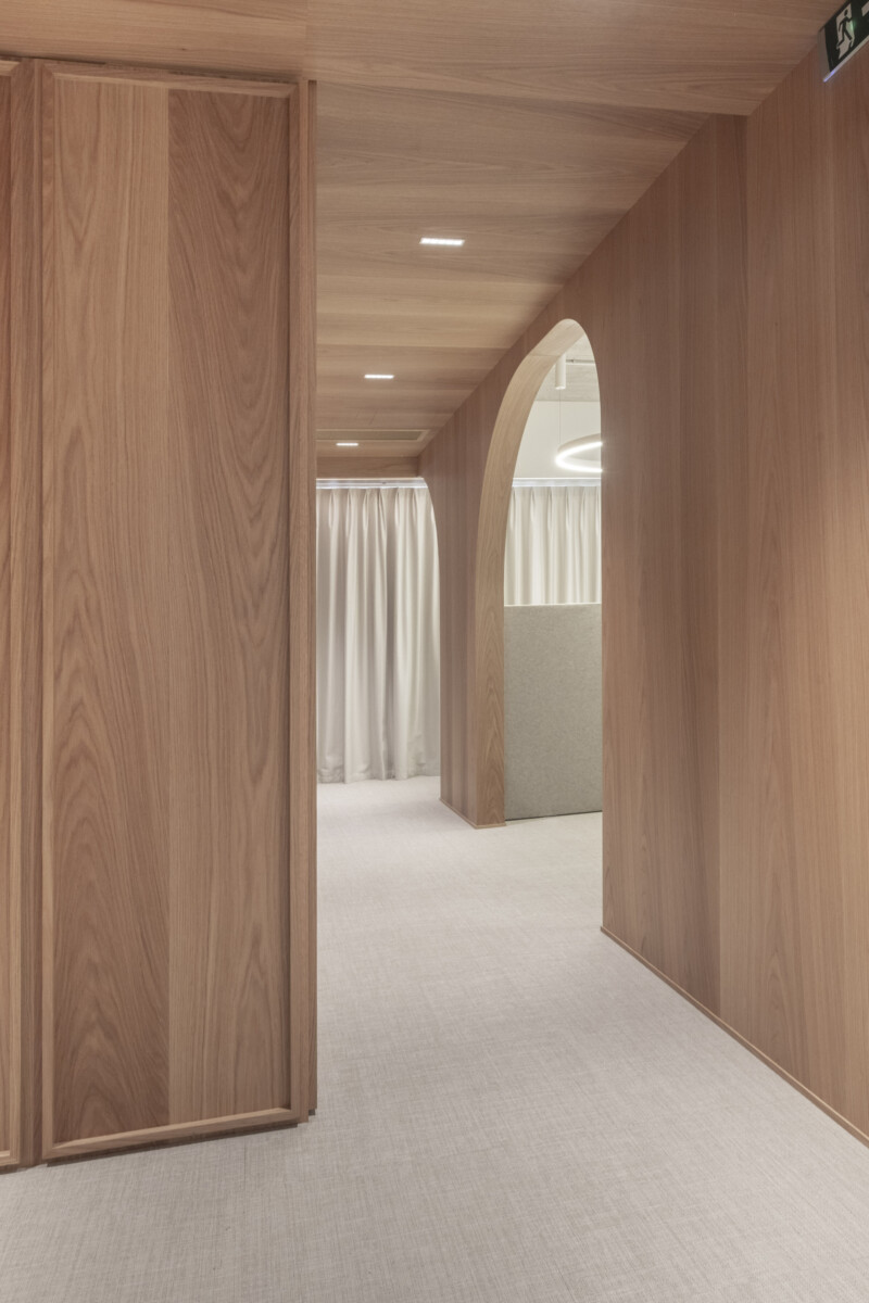 A fundamental distinction is made between main and auxiliary spaces, signified through material selection. The primary and more communal areas are unified through the exposure of the concrete ceiling while also being dressed in white velvet curtains that extend from ceiling to floor. Conversely, the auxiliary rest and break areas are sculpted within a “wooden universe”. The use of wood evokes tranquility and expresses the company’s care and consideration for its people. Upon entering the offices, the semi-transparent boundary of the woven metal curtain guides the visitor toward the reception area.