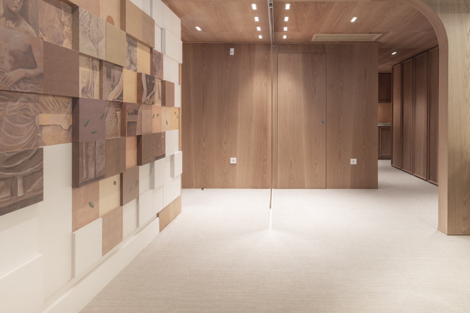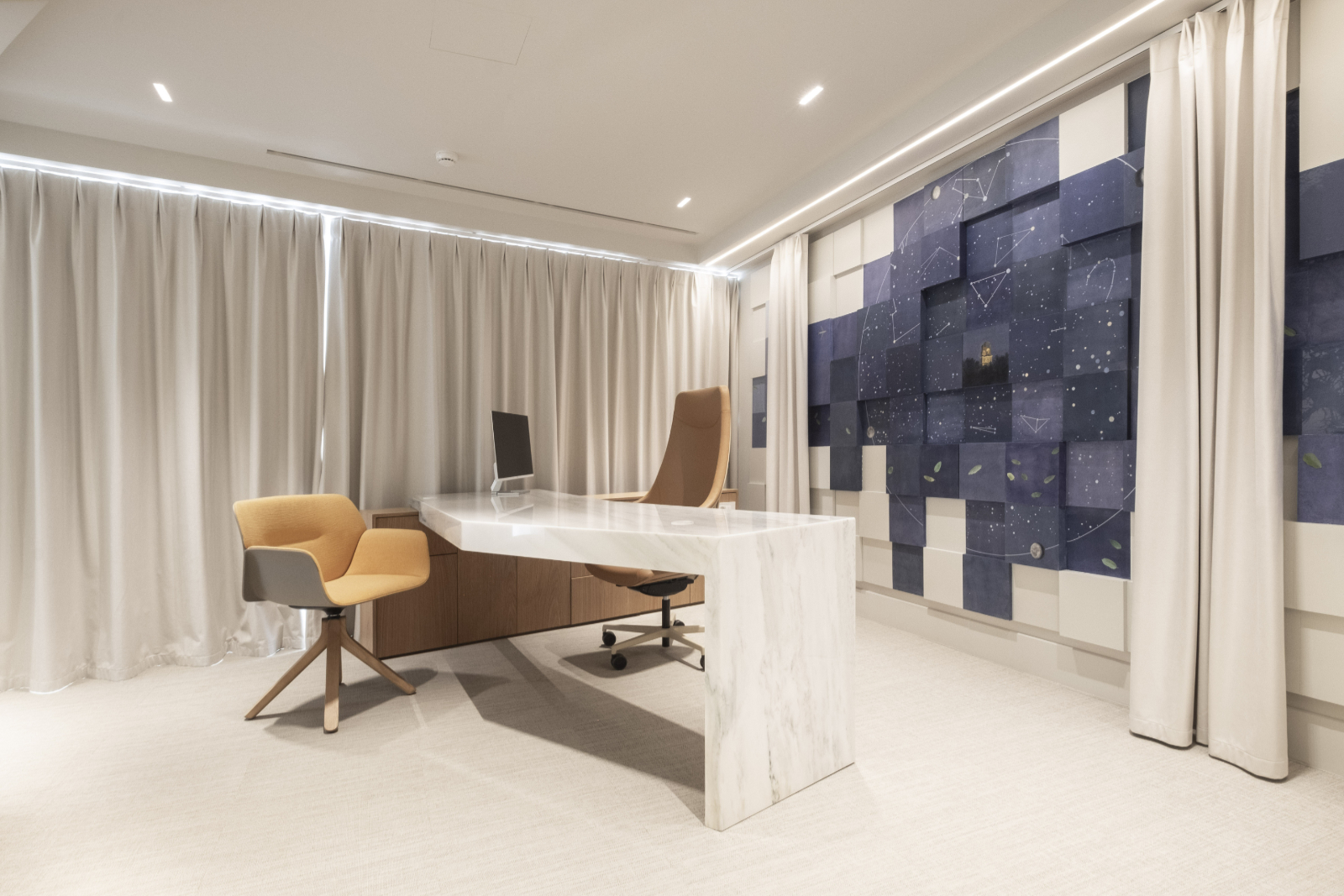 English description: The architectural firm Your Space Experience undertook the renovation of the offices of the shipping company Sea Transportation. The objective was to create a spatial experience that non-verbally conveys to the visitor a sense of security and trust while simultaneously placing them in a VIP environment that exudes prestige and creativity.
