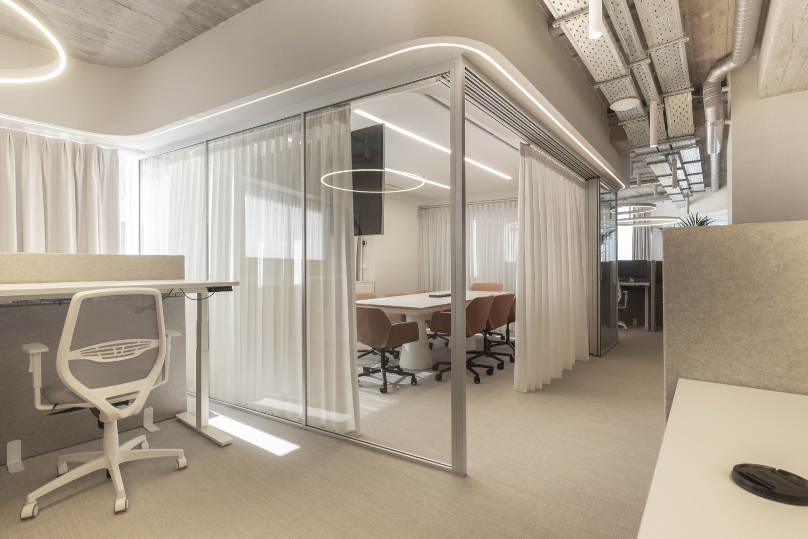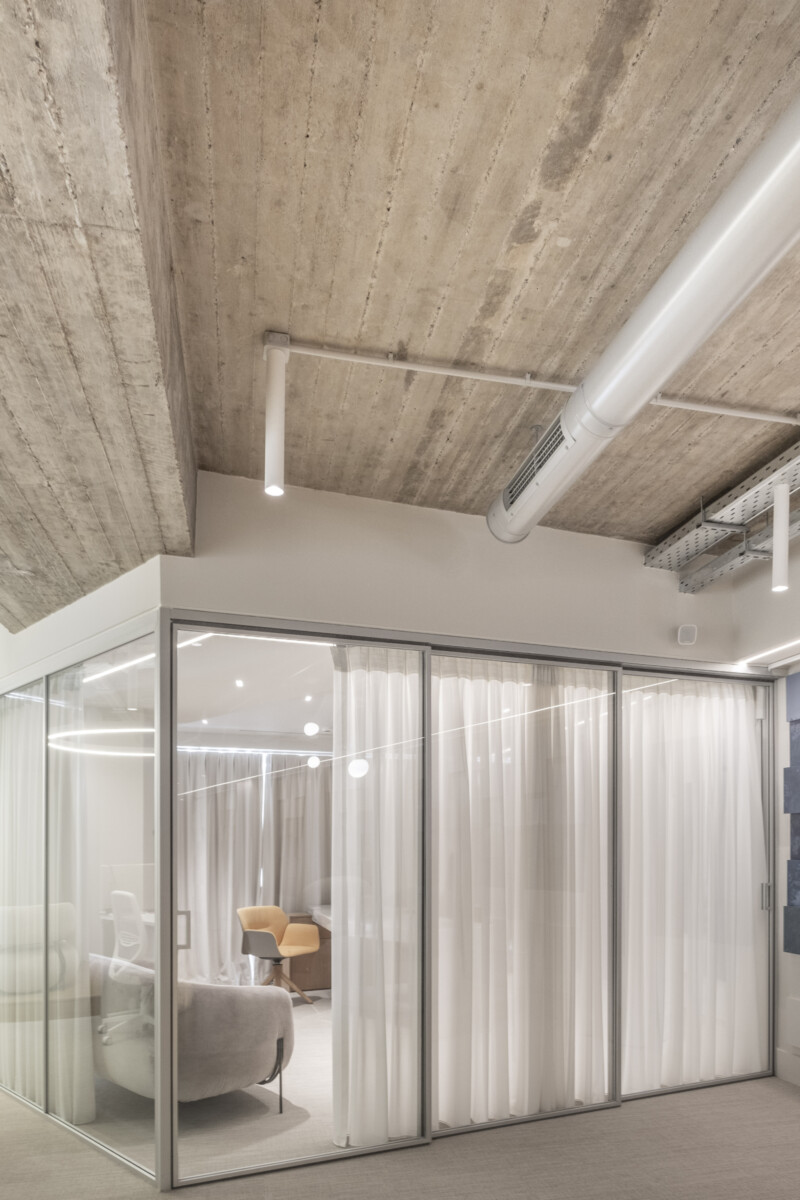 The curtain encapsulates the core idea of flexibility and spatial connectivity, enhancing the dynamic character of the space. The exposure of the concrete ceiling highlighted the building’s shell, offering maximum height but also presenting challenges in designing the ventilation and air conditioning networks, ultimately leading to the solution of exposed service routes. For the open workstations, flexible office furniture with adjustable height and sound-absorbing panels were chosen to allow for partial isolation.