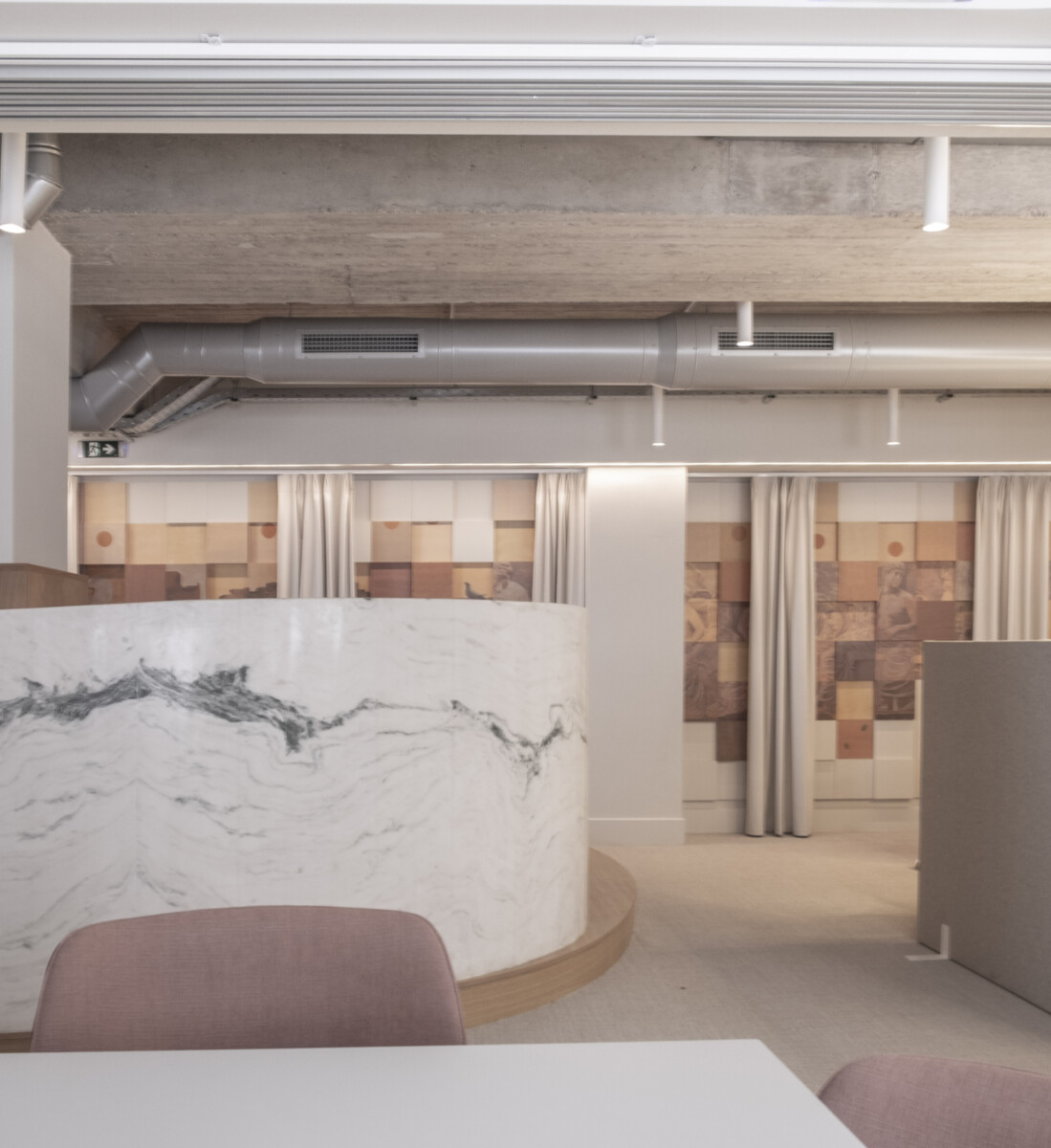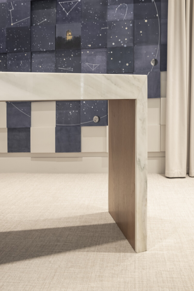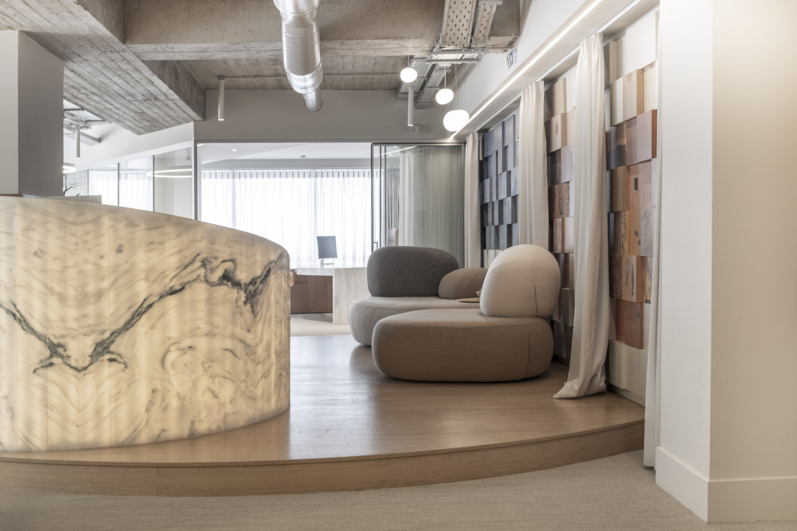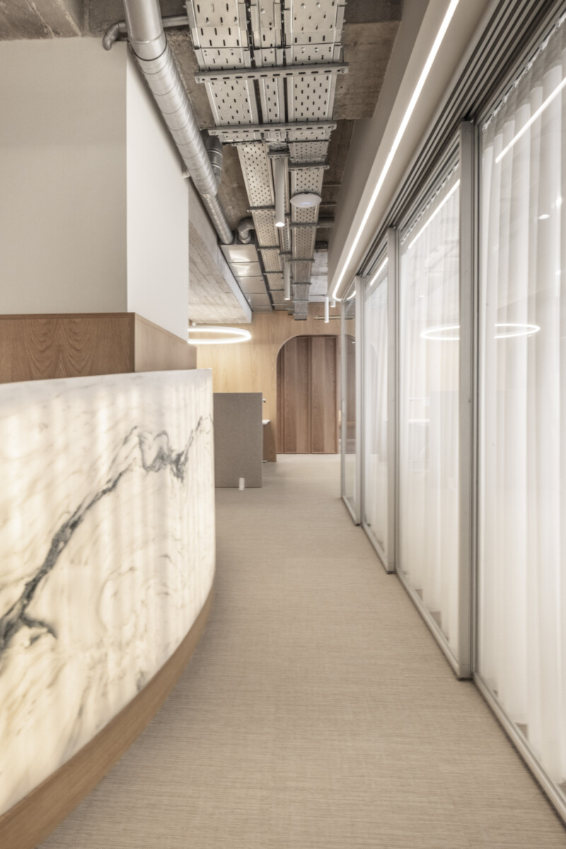 The reception desk, a custom-made structure of curved Dionysus marble with internal lighting, becomes the core of the company. It is positioned on a wooden platform, offering guests a complete view of the company’s activities. This emblematic reception furniture posed both design and construction challenges.