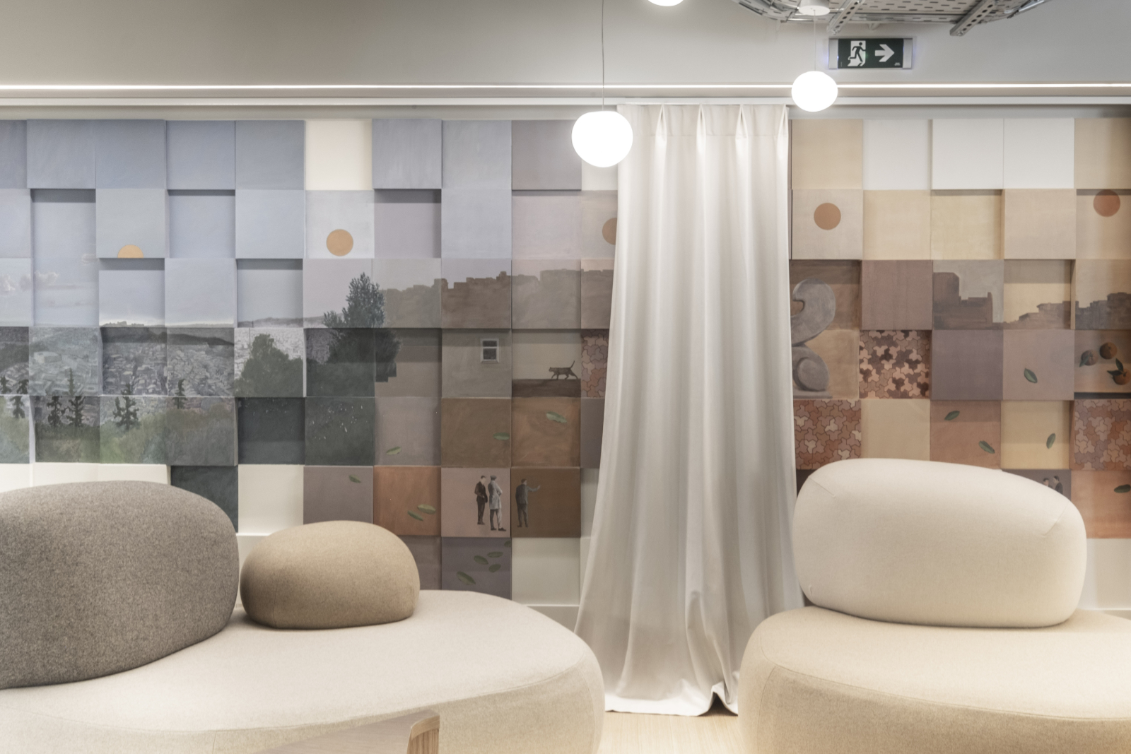 A 15-meter-long artwork by visual artist Giannis Selimiotis extends along the blind wall from the entrance to the sea, narrating a story and transitioning between color palettes using the hues of the company’s logo. Created in the artist’s studio in pre-measured segments, the artwork was carefully transported and installed in the space.