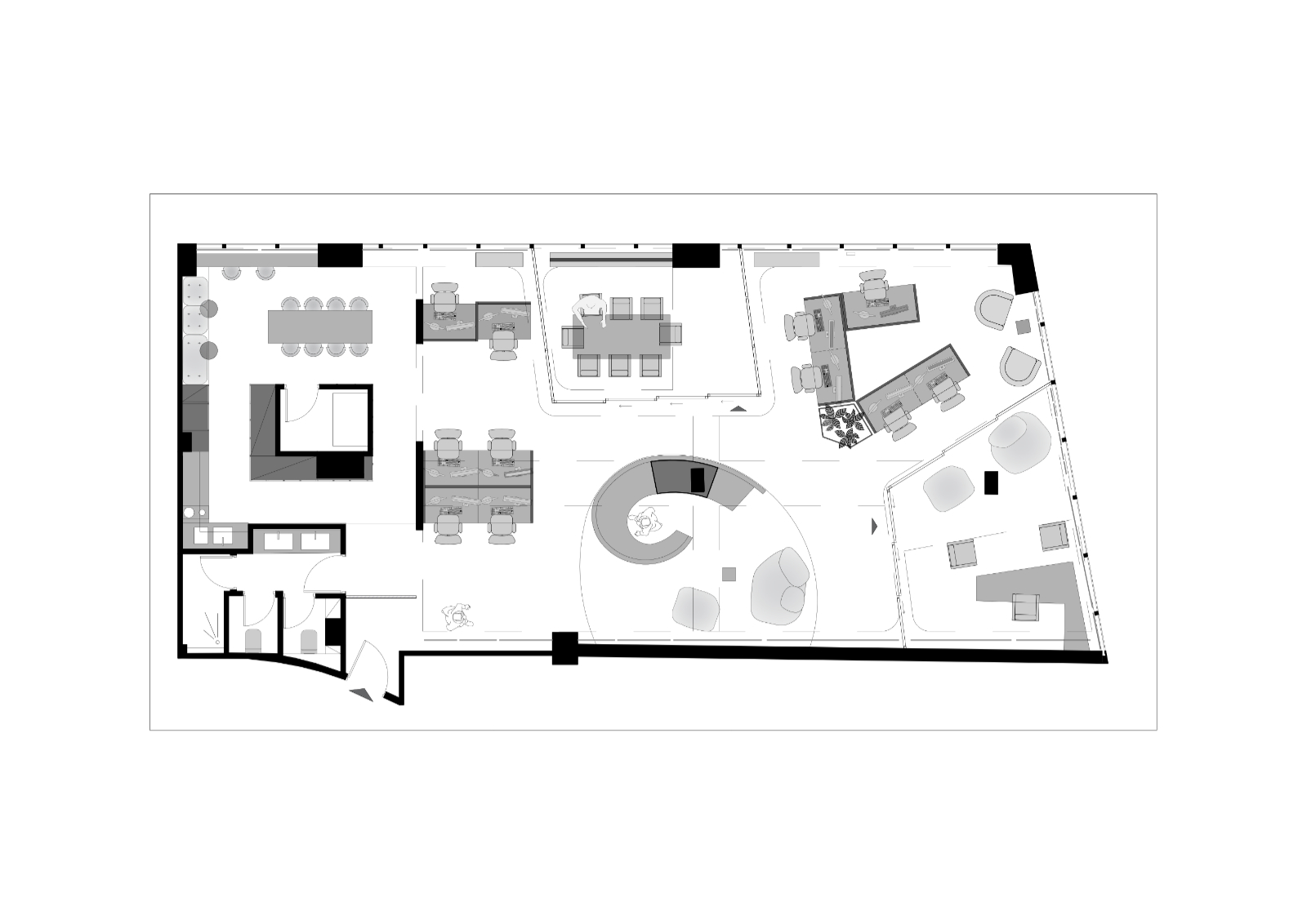 Η κουρτίνα ενσωματώνει την κεντρική ιδέα της ευελιξίας και της σύνδεσης των επιμέρους χώρων και ενισχύει τη δυναμική του χώρου. Η αποκάλυψη της οροφής από μπετόν ανέδειξε το κέλυφος του κτηρίου, προσφέροντας το μεγιστο δυνατό ύψος αλλά έφερε κάποιες δυσκολίες στο σχεδιασμό των δικτύων αερισμού και κλιματισμού και οδήγησε στη λύση των εμφανών διελεύσεων. Για τις ελευθερες θέσεις εργασίας χρησιμοποιήθηκαν ευέλικτα έπιπλα γραφείων με ρυθμιζόμενο ύψος και ηχοαπορροφητικά πανελς για να επιτρέπουν την μερική απομόνωση.