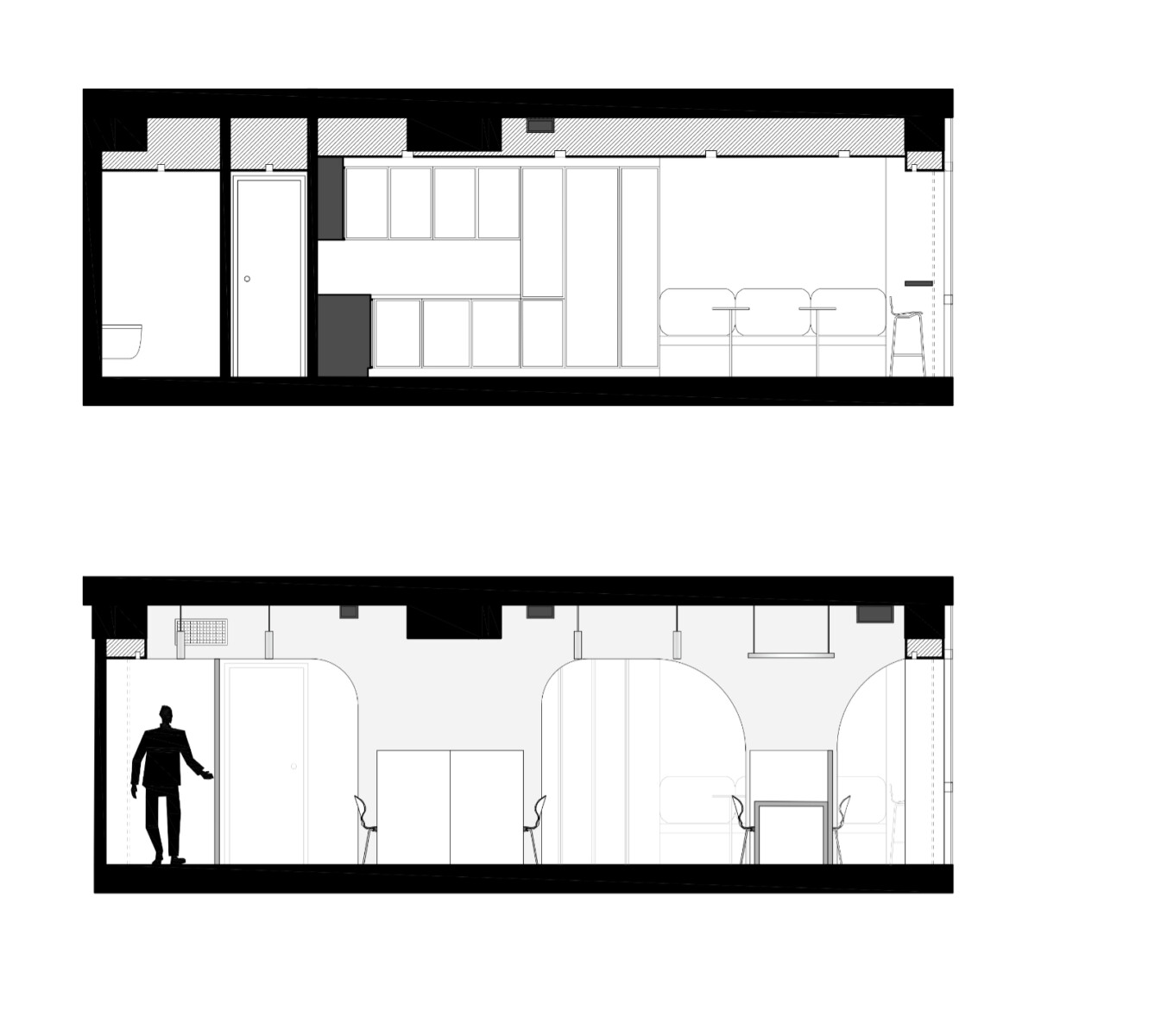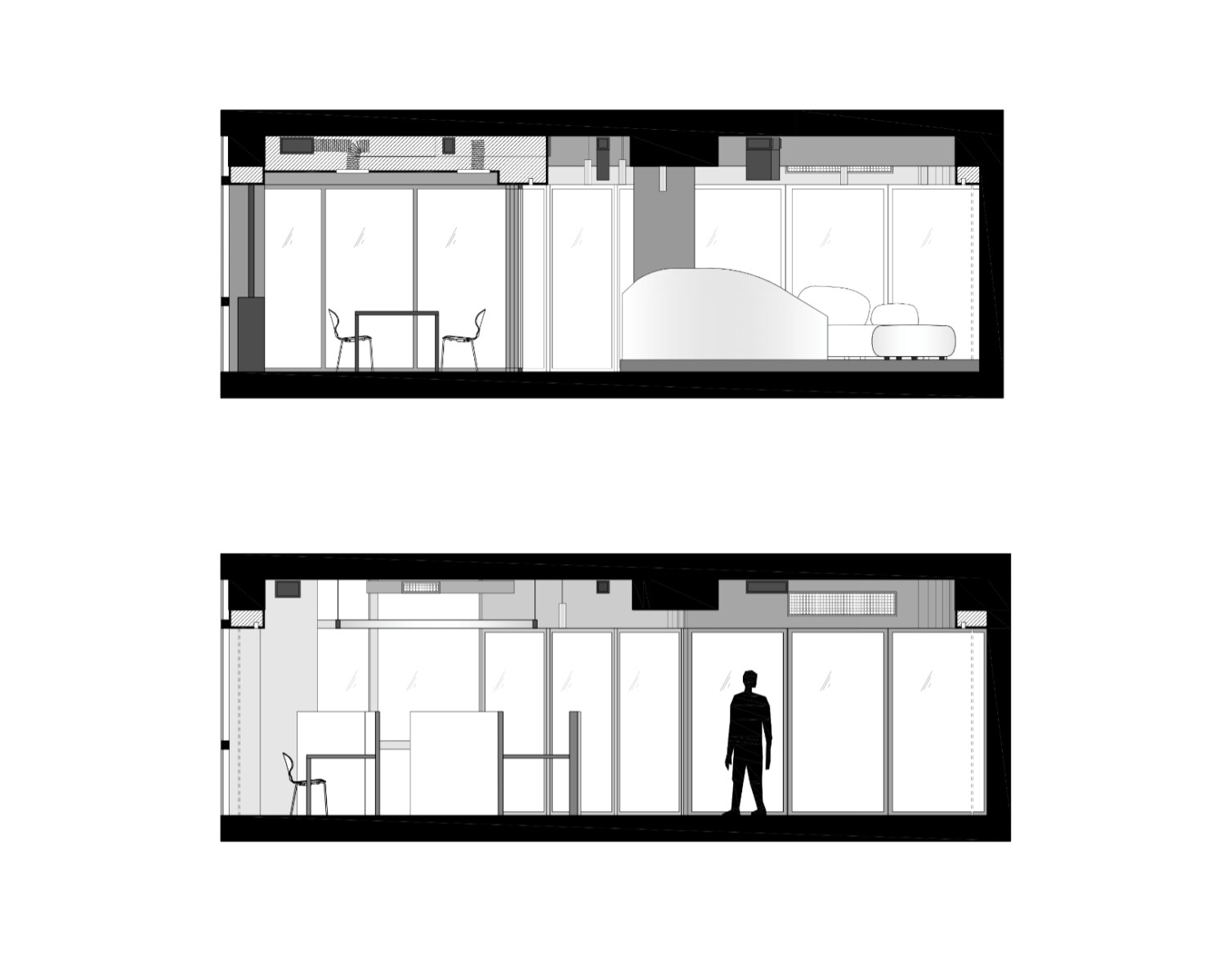 Two glass volumes, the meeting room and the CEO’s office, are positioned at the center and the edge of the open-plan office, dividing the open workstations into two sections corresponding to management and chartering. These volumes, constructed from sliding glass panels, can either integrate with the rest of the space or be isolated both acoustically and visually.