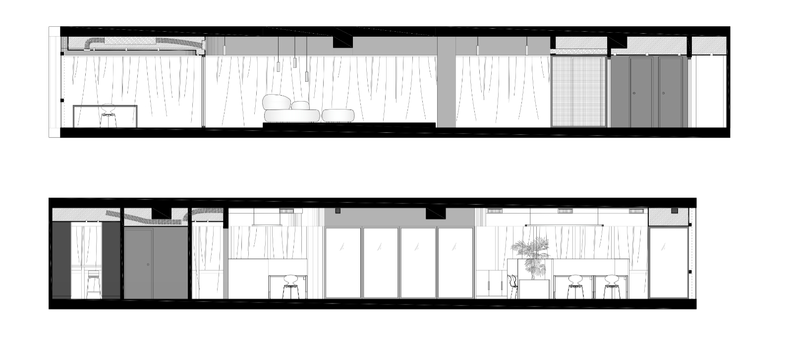 The space is characterized by fluidity and flexibility, creating an environment that prioritizes comfort, luxury, and experience. Draped with curtains both peripherally and internally, the space is unified, reinforcing the sense of security and VIP exclusivity, while simultaneously allowing the curtains to interact with the architectural elements they encounter. Their density fluctuates—thickening, thinning, becoming heavier or lighter—creating a sense of continuous movement and transformation, playing with objects and views along their path.