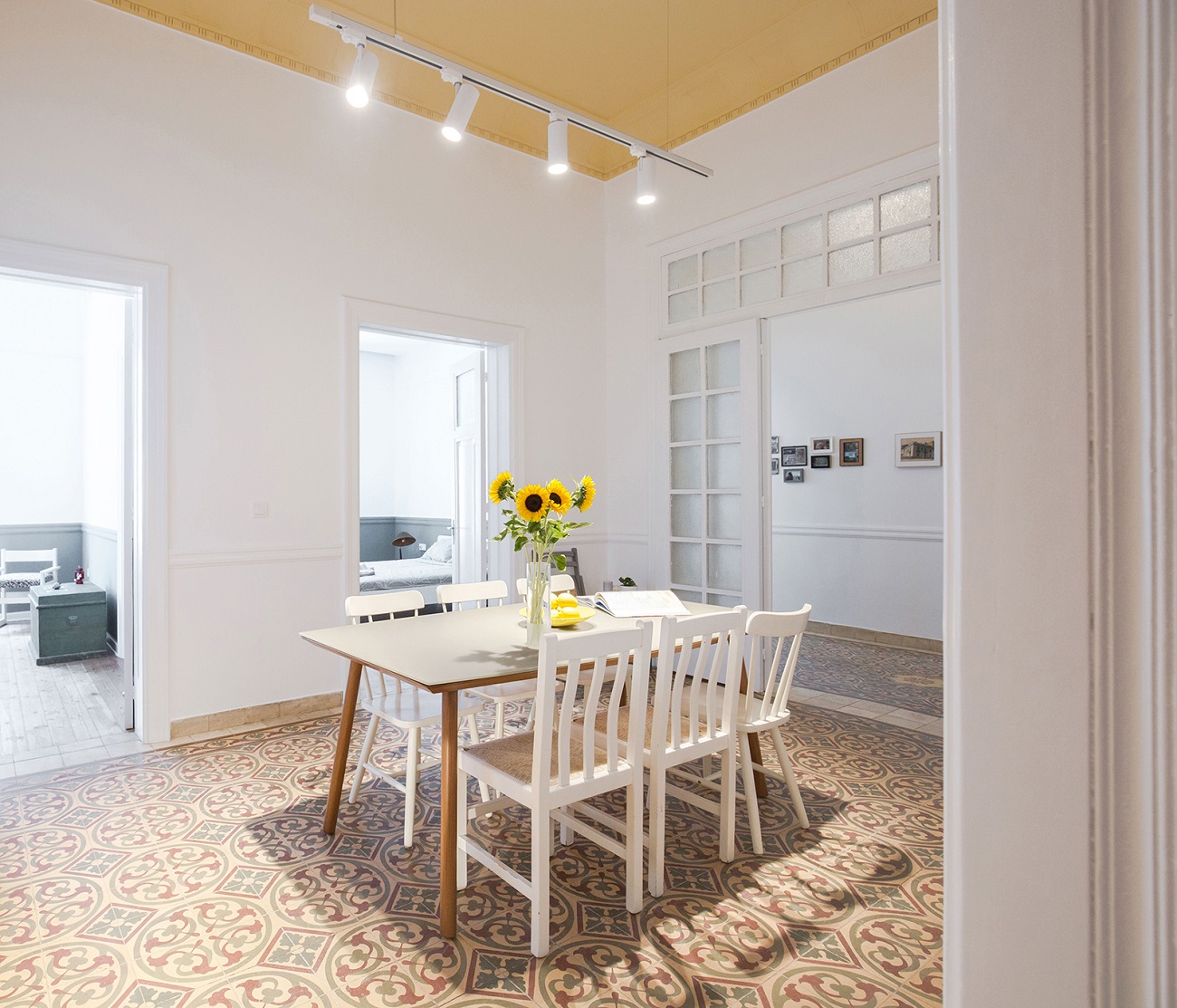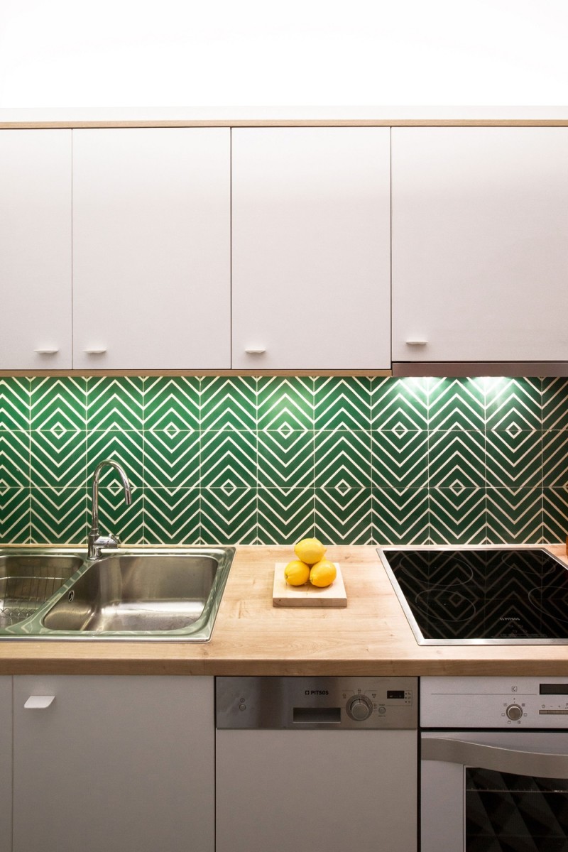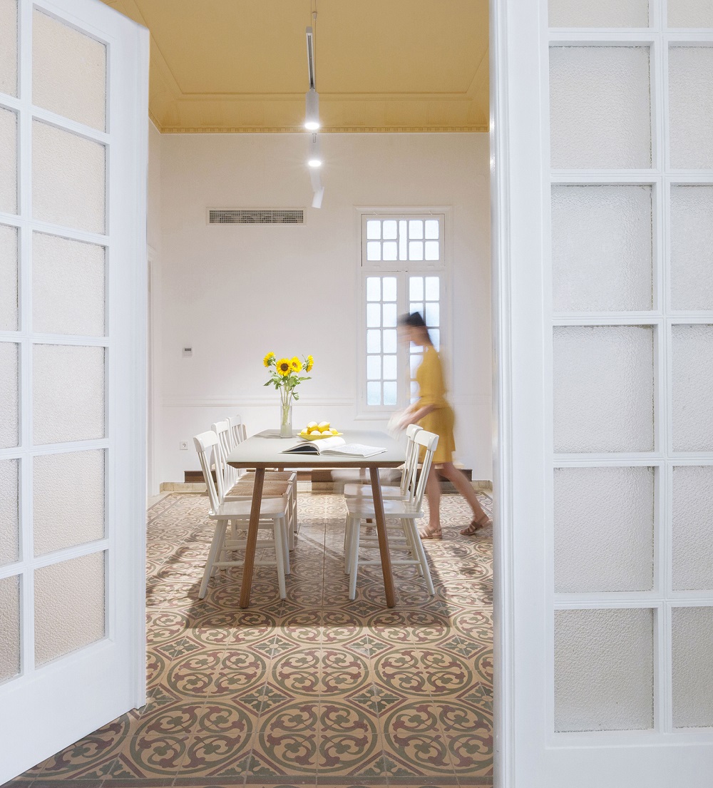The existing cement tiles were conserved and new handmade ones were added in the kitchen. Original features like doors, windows and timber floors have been maintained and given a new look by being painted white or clear varnished.