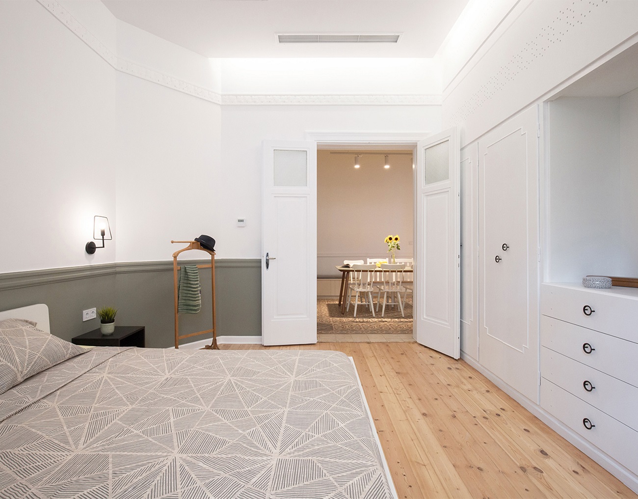The master bedroom original wardrobe was transformed and a white lacquered dot-patterned panel was designed to cover its top part, which was blocked by the new central air-conditioning system.