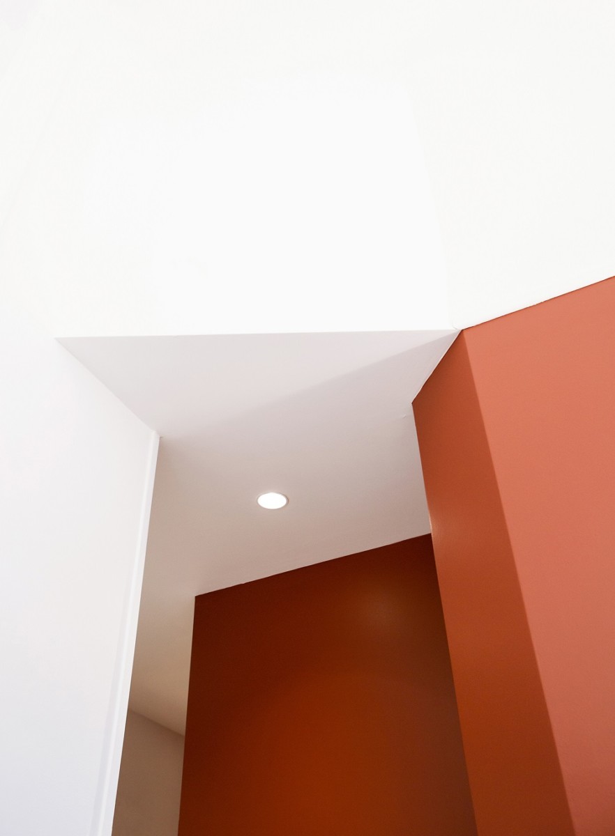 Το λευκό χρώμα που επικρατεί πλαισιώνει τα διαφορετικά χρώματα που επιλέχθηκαν για τον κάθε χώρο. Στο χωλ και την τραπεζαρία, η ώχρα του δαπέδου “καθρεπτίζεται” την οροφή, στα υπνοδωμάτια το πράσινο λεβάντας καλύπτει τη βάση των τοίχων και οι τοίχοι του διαδρόμου χρωματίστηκαν σε πορφυρή απόχρωση αναδεικνύοντας τα υφιστάμενα τσιμεντοπλακάκια.