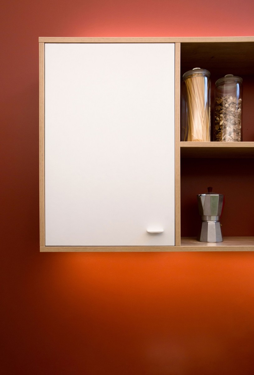 The apartment is brightened by the new colour scheme with white colour being dominant in every space. The use of colour interacts differently with the surfaces of each space; ochra covering the entrance hall and dining room ceiling and laventer green covering the walls lower surface in the sleeping rooms. The walls of the corridor leading to the kitchen and the bathroom have been crimson painted to suit the existing cement tiles.