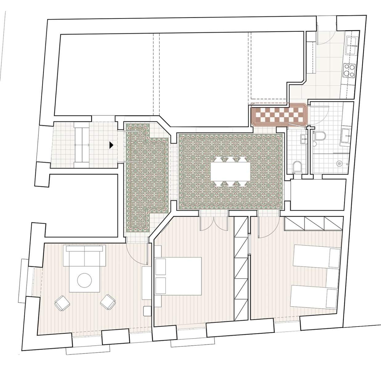 The refurbishment was designed to highlight the buildings qualities and unique architectural features. A new kitchen, bathroom and WC were designed and a series of small interventions were made to adjust the apartment to contemporary needs. Several patterns found in the building fabric were highlighted and new ones were inserted to complement the existing ones.