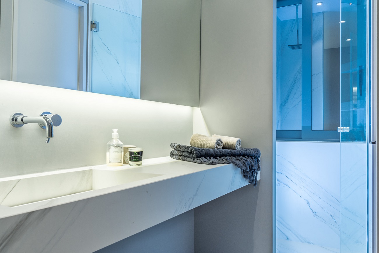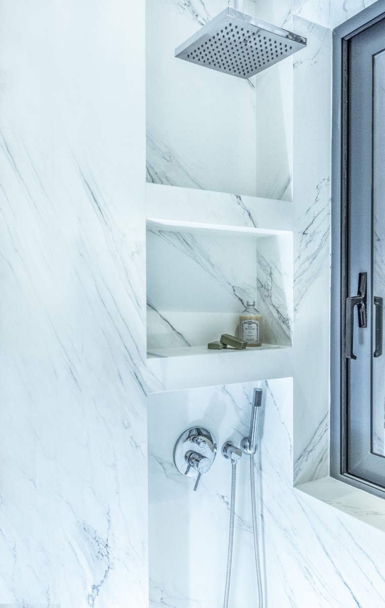 On the other side of the apartment, a corridor leads to the two bedrooms and to the main bathroom. The master bedroom has its own terrace, where there is also a build-in couch and perimetrical flower boxes with bamboo. All the floors of the apartment are covered with wood, while large granite tiles in marble texture are used in the bathrooms.