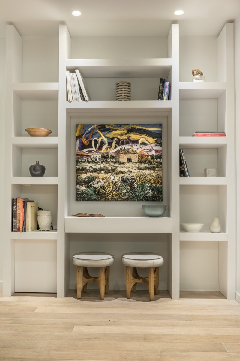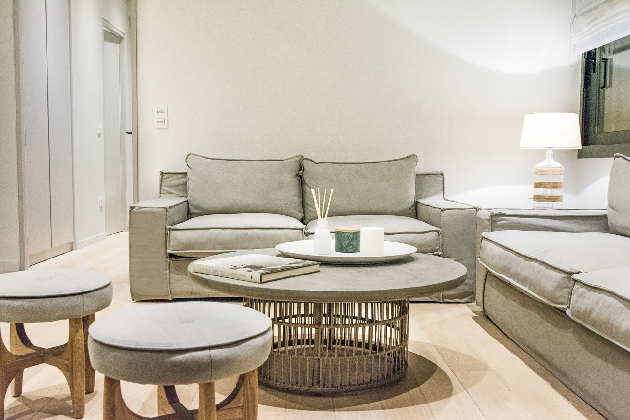 Στο σύνολο τους, οι ξύλινες επενδύσεις, οι φυτεύσεις και τα χτιστά καθιστικά δημιουργούν ιδιαίτερους υπαίθριους χώρους ως φυσική συνέχεια του εσωτερικού, καταστρατηγώντας διακριτικά τα συμβατικά όρια του διαμερίσματος.