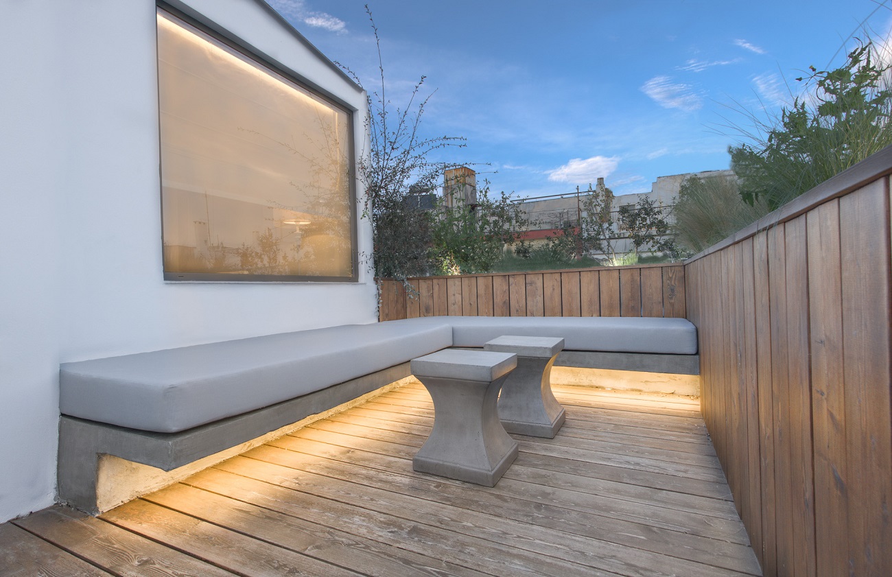 Overall, the wooden linings, the plantation and the built-in couches create interesting outdoor spaces, which come as a natural extention of the interior, “breaking” the conventional boundaries of the apartment.