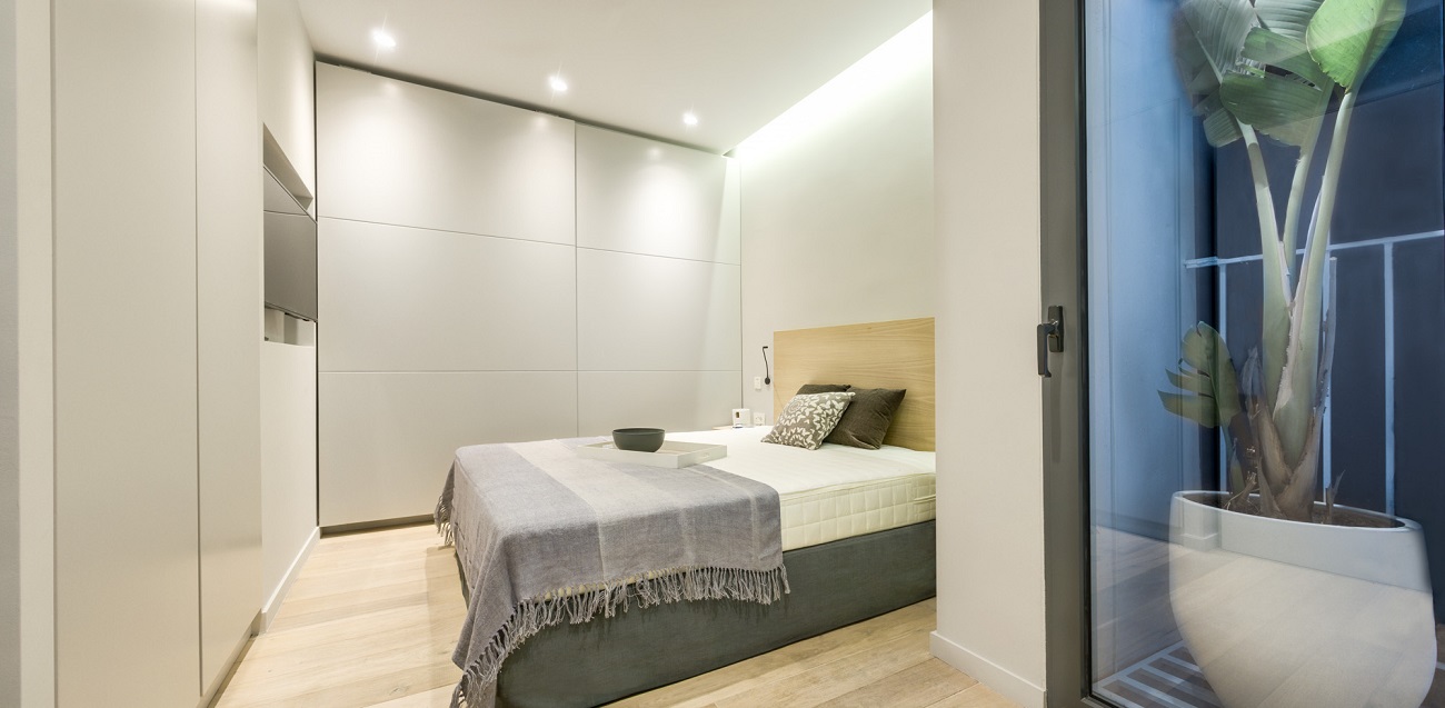 Από την άλλη πλευρά του διαμερίσματος, ένας διάδρομος οδηγεί στα δυο υπνοδωμάτια και στο κυρίως λουτρό. Το master υπνοδωμάτιο εκτονώνεται στη δική του βεράντα, όπου έχει και αυτό χτιστό καθιστικό και περιμετρική φύτευση. Όλα τα δάπεδα του διαμερίσματος έχουν επενδυθεί με ξύλο, ενώ στα μπάνια χρησιμοποιήθηκαν μεγάλα γρανιτοπλακάκια με όψη μαρμάρου.