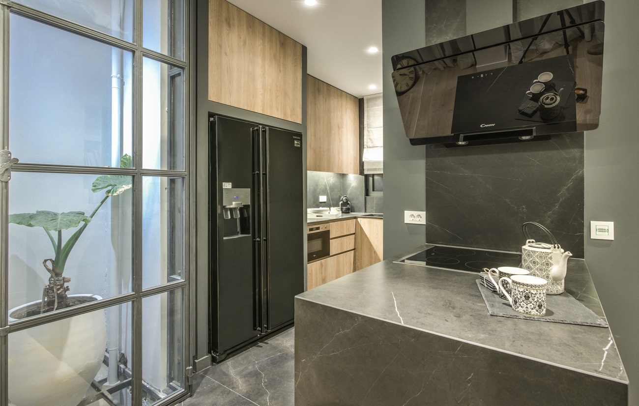 A unique feature of the apartment design is the creation of large openings in the two lumens that pre-excisted, thus leading the light into the interior space, creating luminous intensities. By placing large plantation inside them they look like small atriums, underlining the continius correlation of the interior and the exterior space.