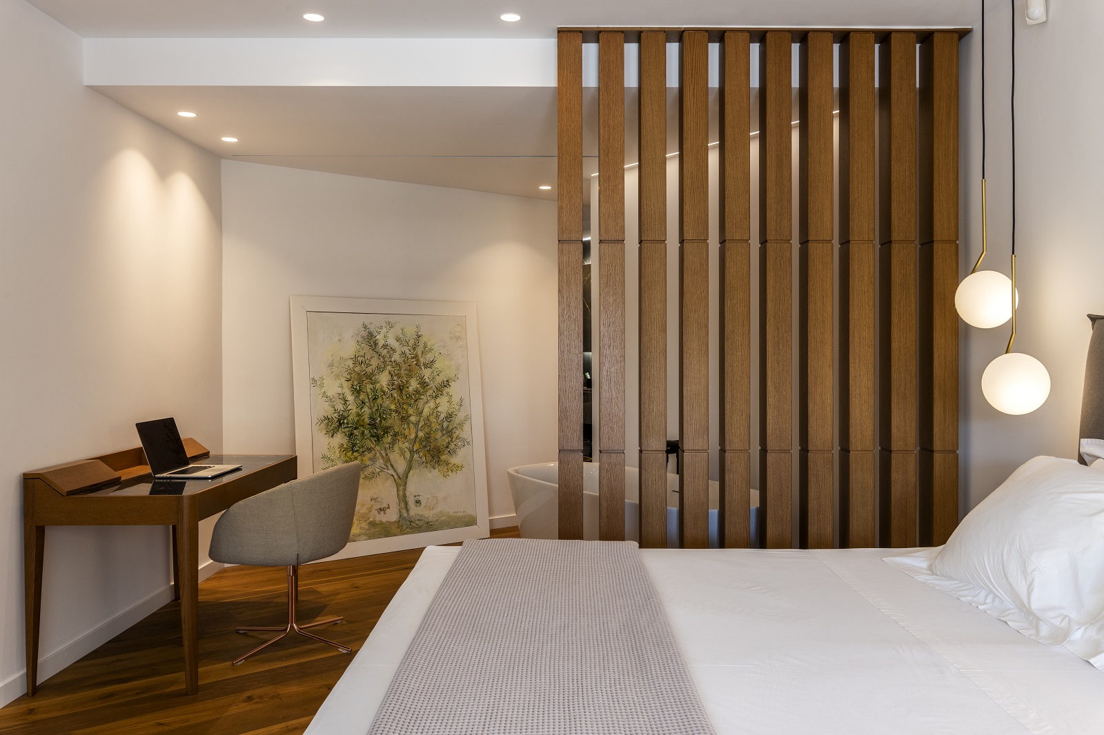 Ιδιαίτερο σχόλιο γίνεται για την σχέση της ελεύθερης τοποθέτησης της μπανιέρας στο χώρο του κυρίως υπνοδωματίου, με ξύλινα διαχωριστικά φίλτρα, με συνδυασμό ενός στοιχείου τέχνης στο πάτωμα, ως ισορροπία νερού, πράσινου και ξύλου.