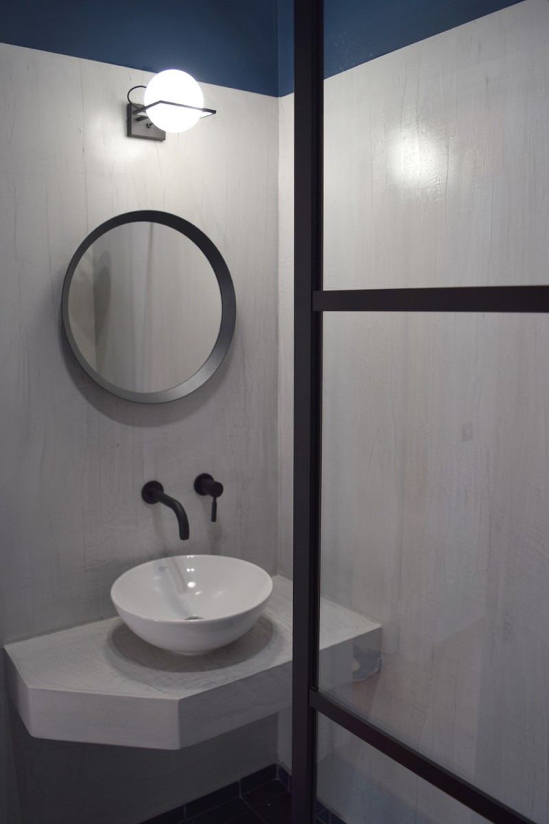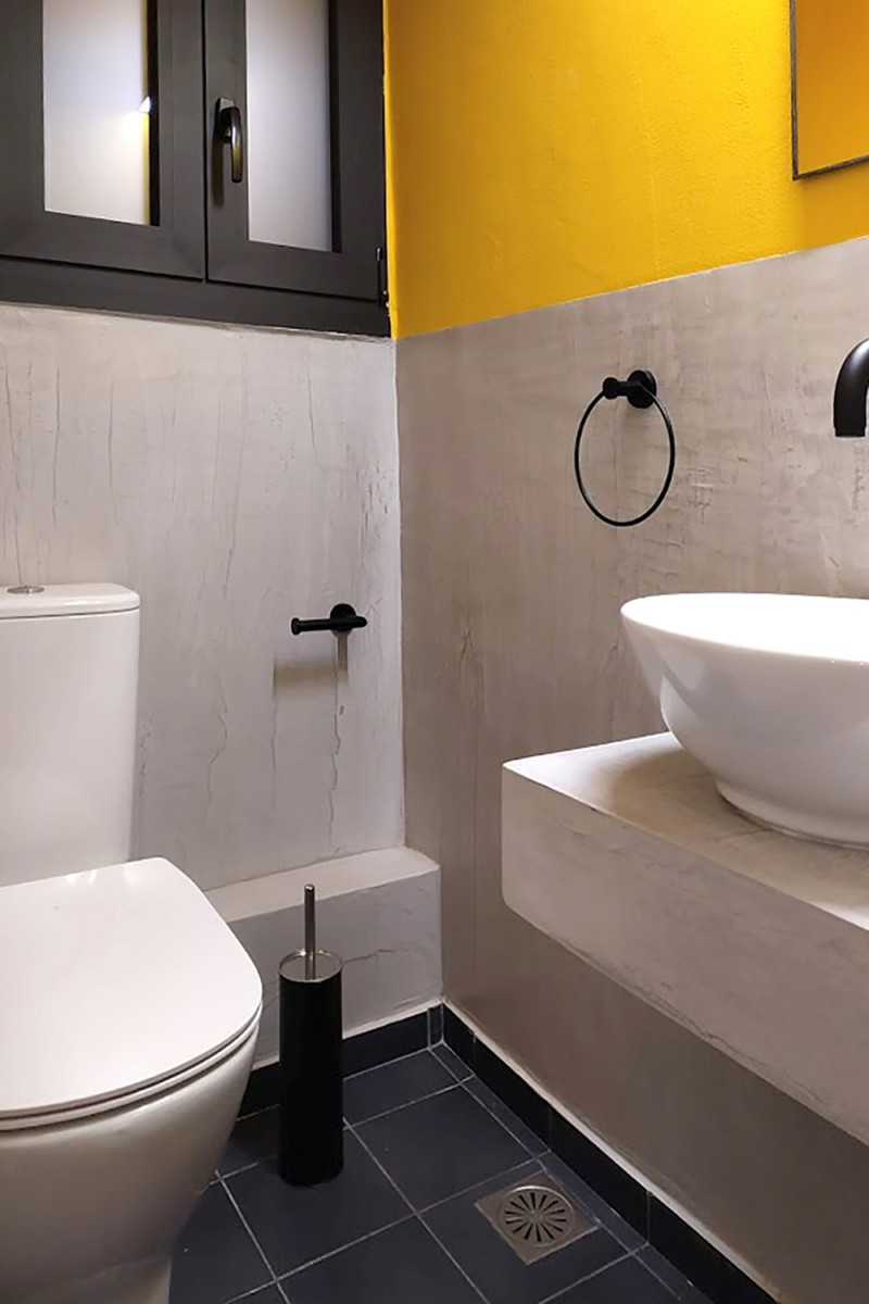 “Έντονες αποχρώσεις του κίτρινου και του μπλε αντιπαρατίθενται με επιφάνεις τσιμεντοκονίας και ξύλου δημιουργώντας αίσθηση αντίθεσης και ζεστασιάς ταυτόχρονα”.