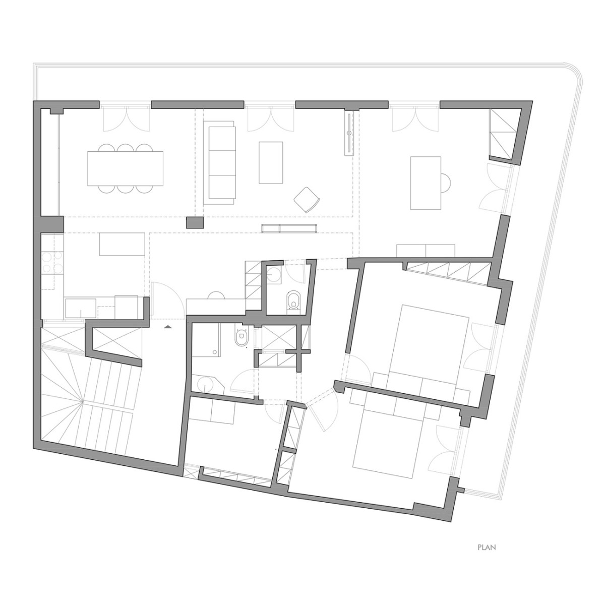 “New lighter boundaries such as the freestanding bookcase create a transparent filter between the public and private spaces of the apartment”.
