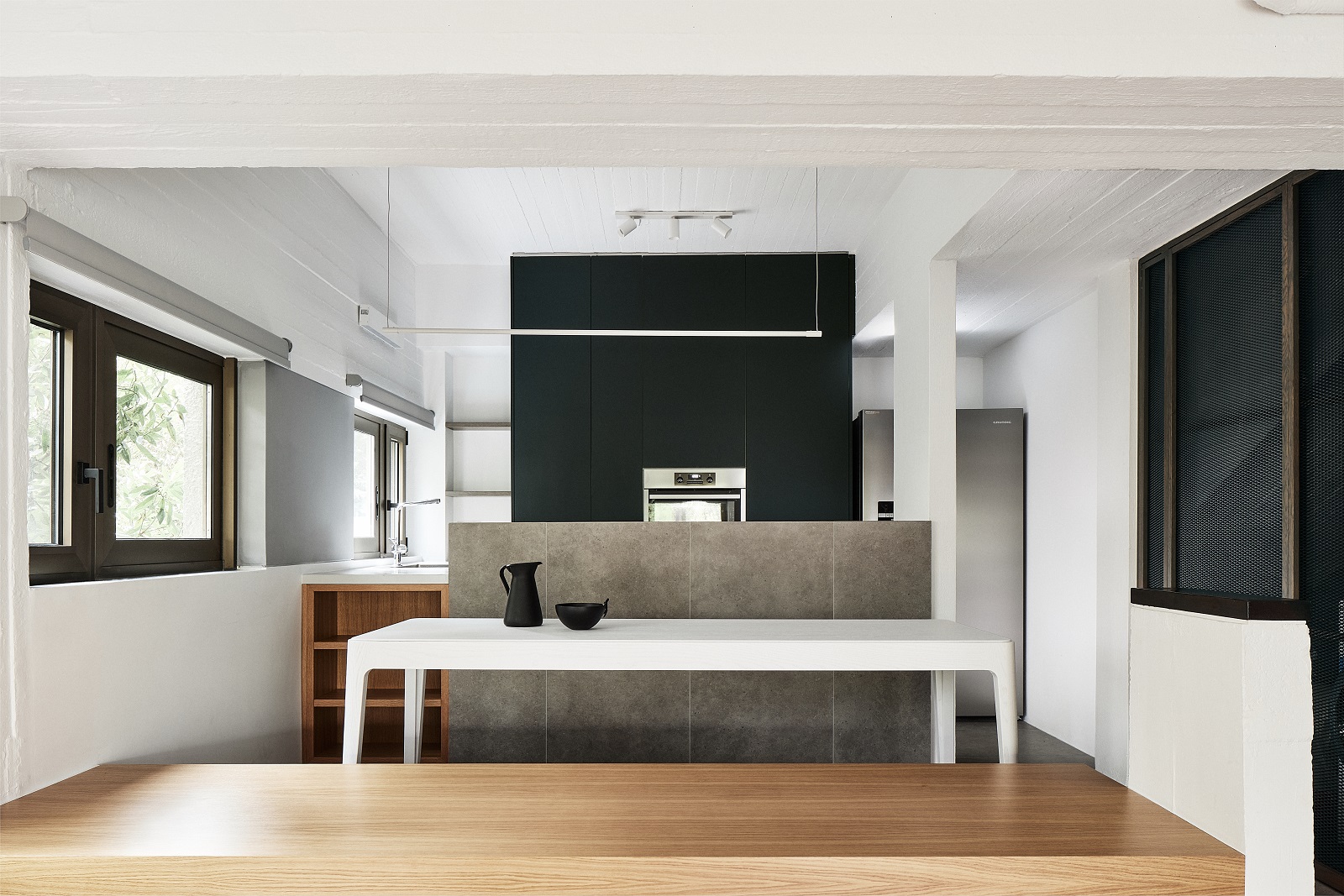 Το ανεπίχριστομπετόν, ο σοβάς και το σκούροξύλο, συνδυάζονται με το σκούρομπλετηςκουζίνας, το κεραμιδίστουπνοδωμάτιο και το φυσικόδρυς στους καθιστικούς πάγκους. Πρόκειται για συνδυασμούς υλικών που συναντάμε και στα έργα των αρχιτεκτόνων.