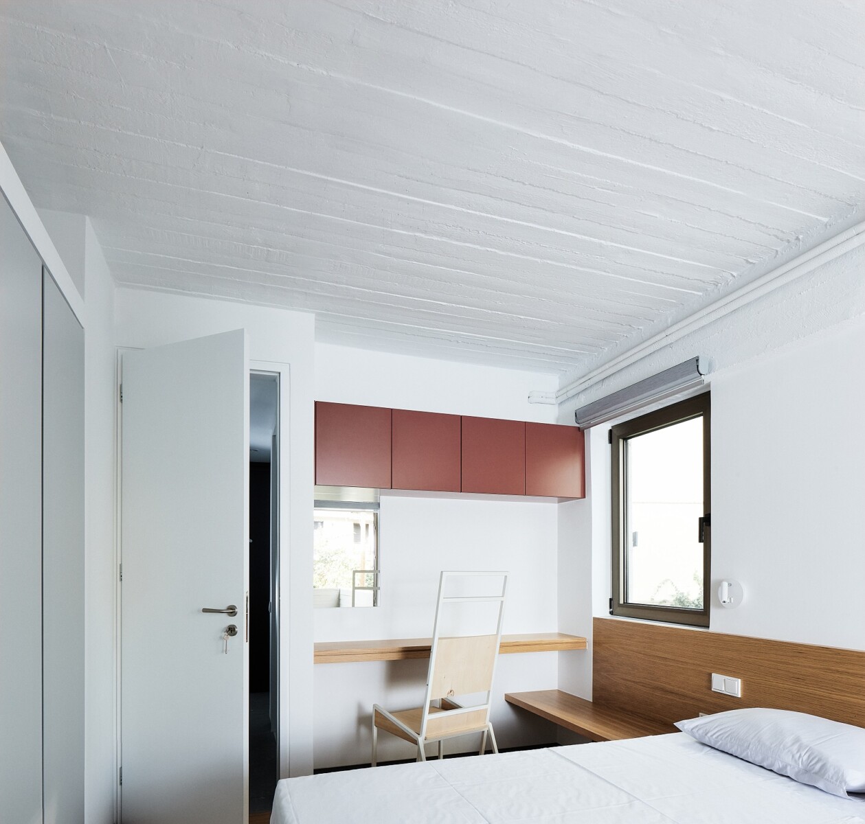 Η παλαιότερη ντουλάπα –εσοχή μετατράπηκε σε μικρό τραπέζι εργασίας με κλειστά ράφια. Σε συνέχεια του γραφείου διαμορφώνεται σε ένα αδιαίρετο σύνολο ο χώρος ύπνου με το κρεβάτι. Η δρύινη επένδυση στη πλάτη του κρεβατιού, κρύβει την απαραίτητη μόνωση και λειτουργεί ως κεφαλάρι με κομοδίνο.