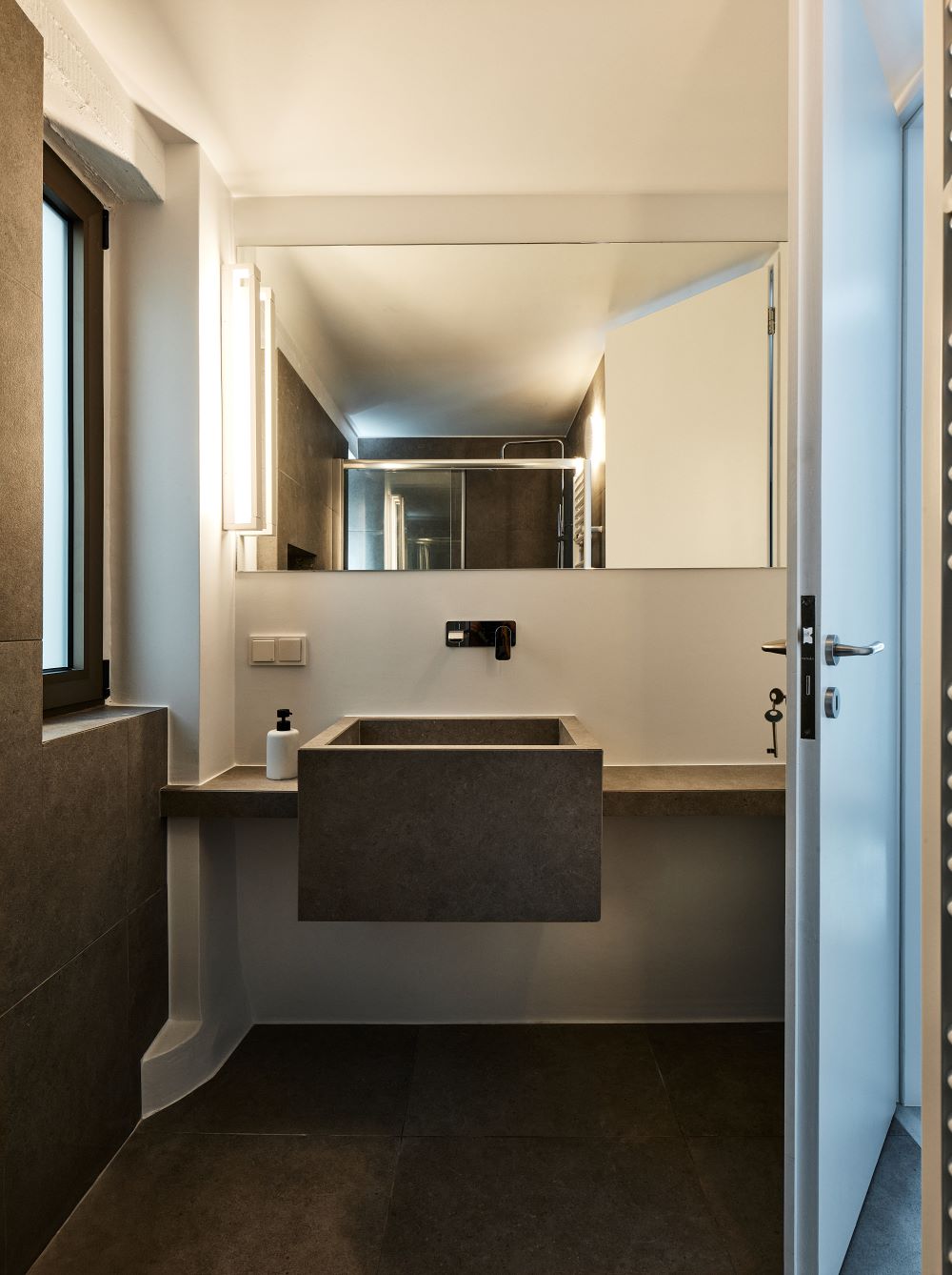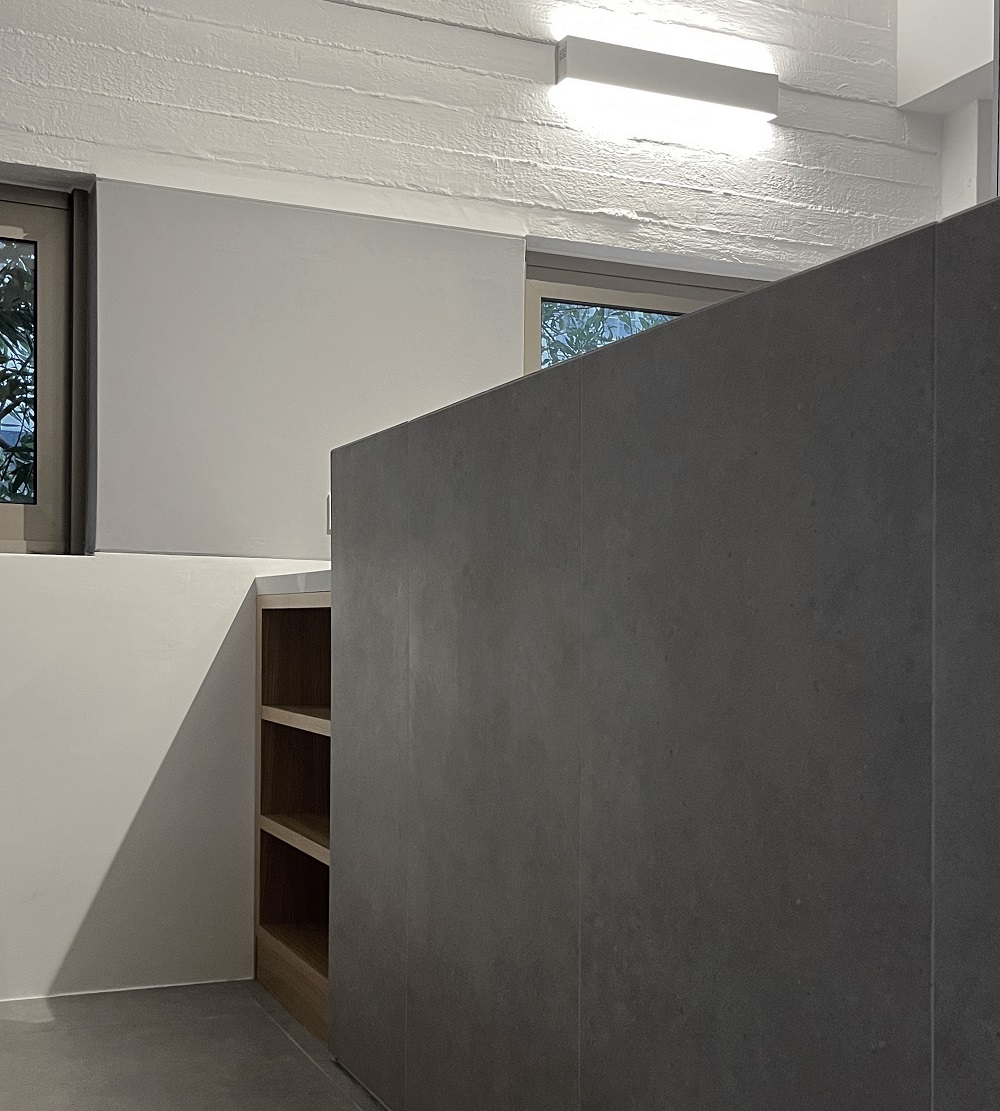 Ο πάγκος με τον νιπτήρα σχεδιάστηκε ως μια ενιαίαχυτήκατασκευή που τελικά επενδύθηκε από πλακάκιατσιμέντου και μωσαϊκού. Η ανακαίνιση ολοκληρώνεται με τη μελέτηφωτισμού. Αξιοποιούνται τα υπάρχοντα σημεία της ηλεκτρικής εγκατάστασης και ενισχύονται με πρόσθεταγραμμικάφωτιστικά ώστε να αναδεικνύουν τις αρχιτεκτονικές γραμμές που δημιουργούνται από τις εναλλαγές αδρού σοβά με ανεπίχριστο σκυρόδεμα.